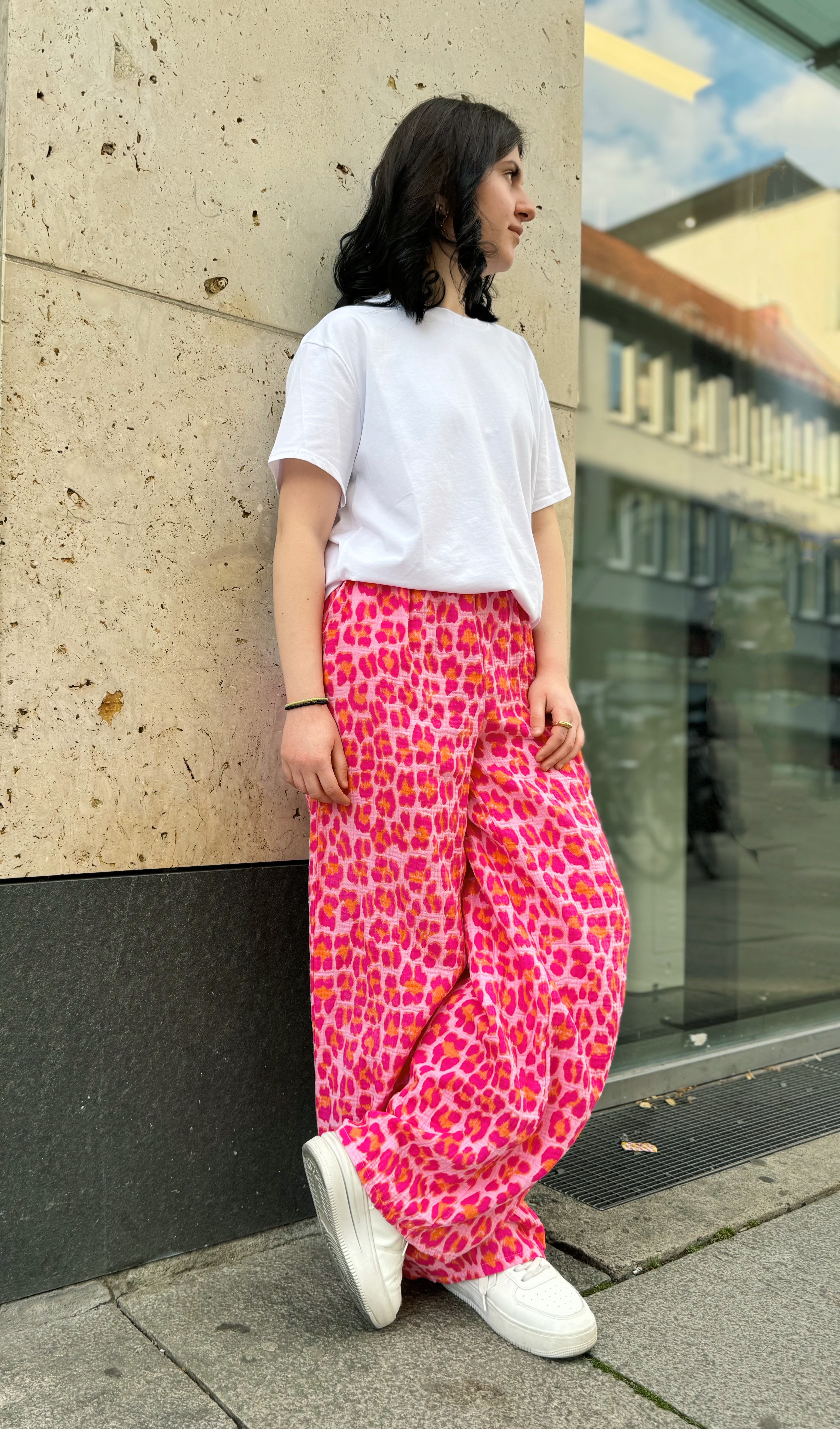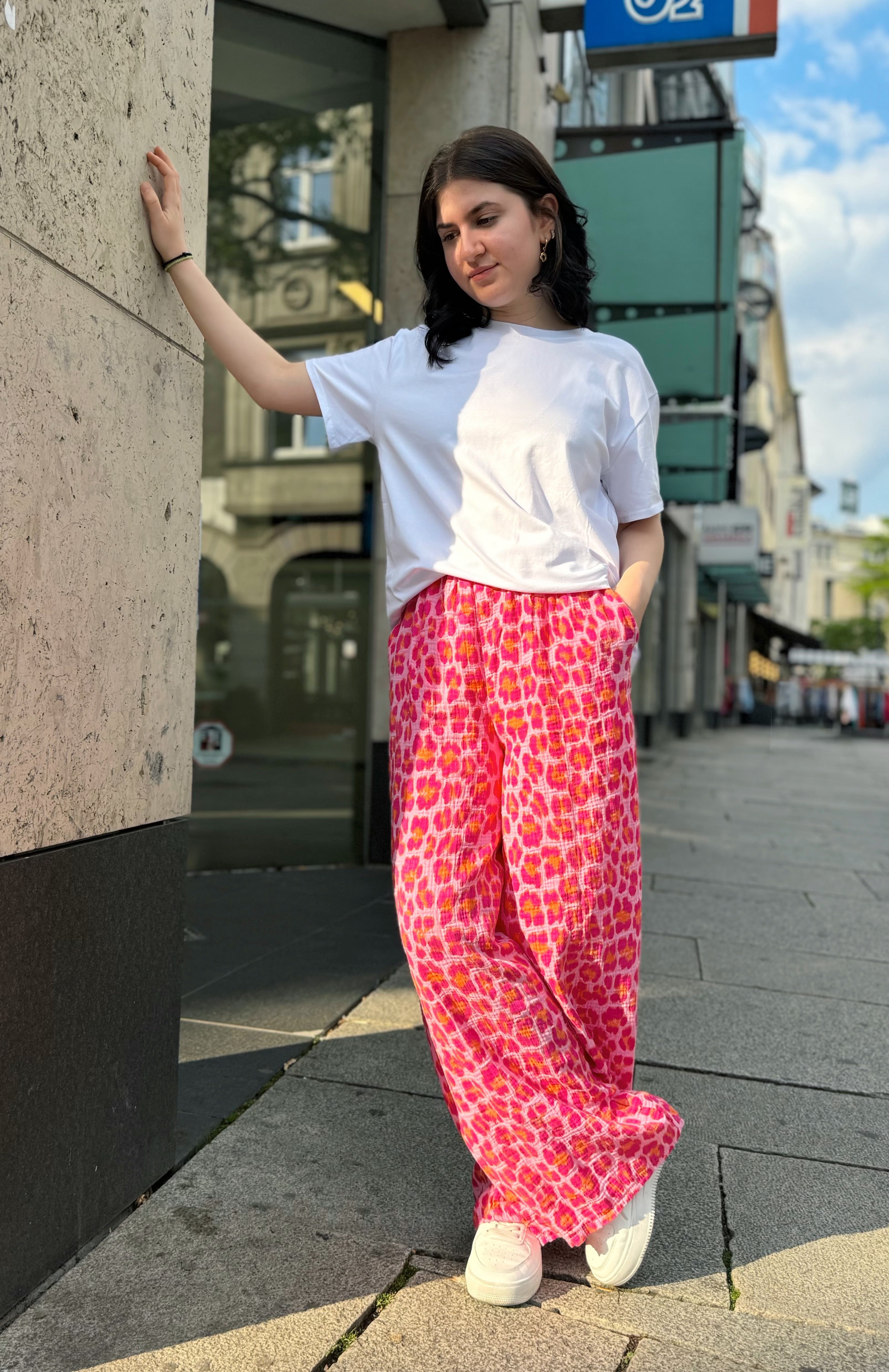 Diese Hose aus Musselin mit Leoprint ist ein absolutes Fashion-Highlight und ein Must-have für alle Fashionistas da draußen! Die Hose verfügt über eine bequeme Passform und einen elastischen Bund, der für einen angenehmen Tragekomfort sorgt.