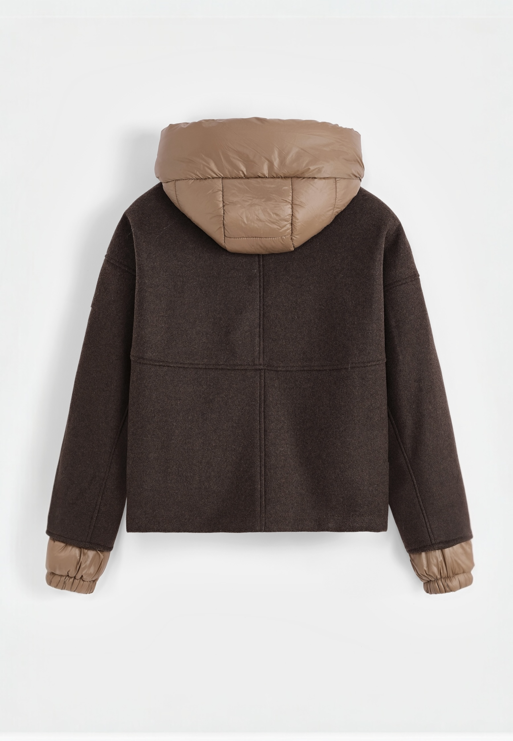 Die gesteppte Kapuze und der Kragen sowie die Ärmelbündchen sind gesteppt.