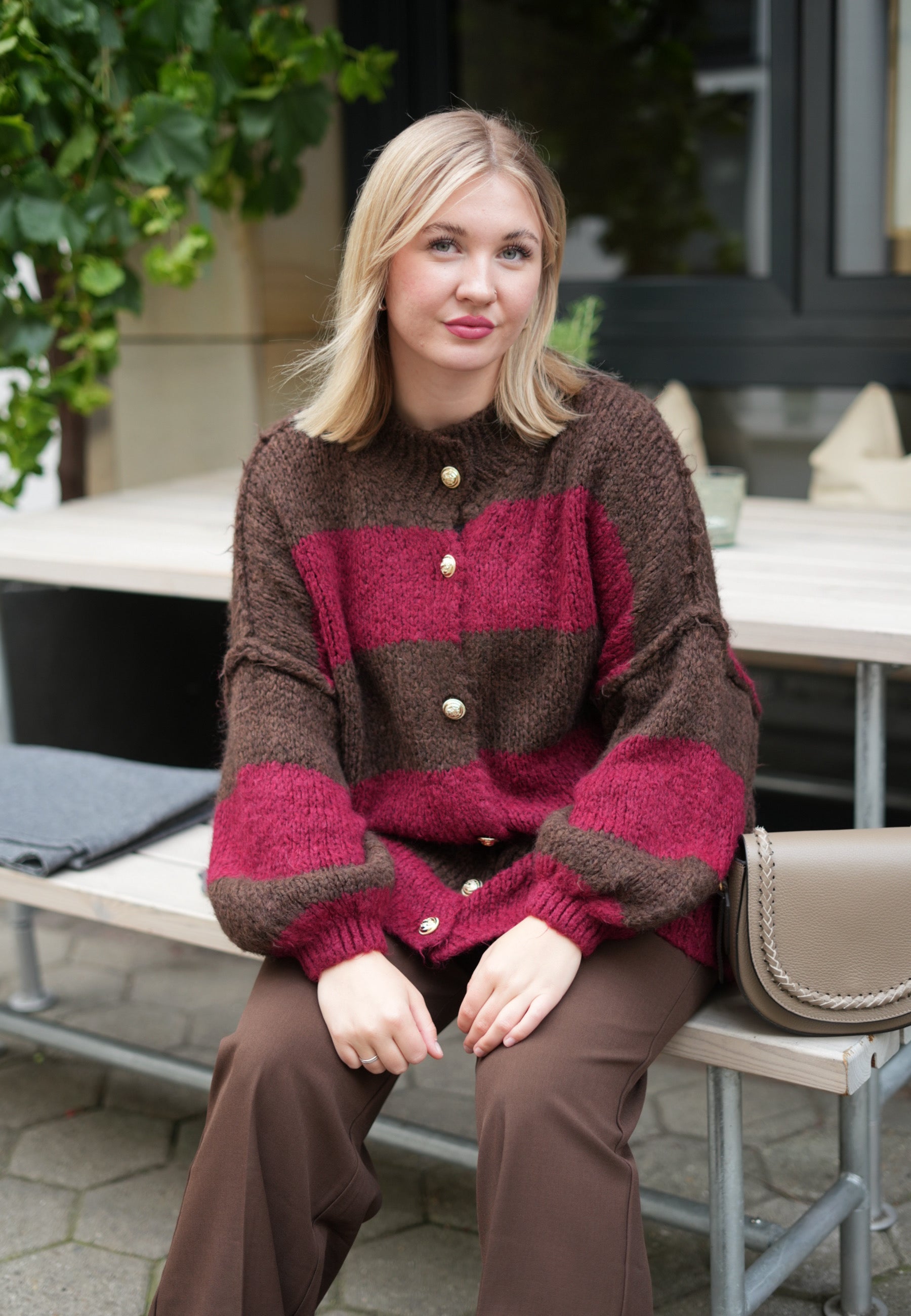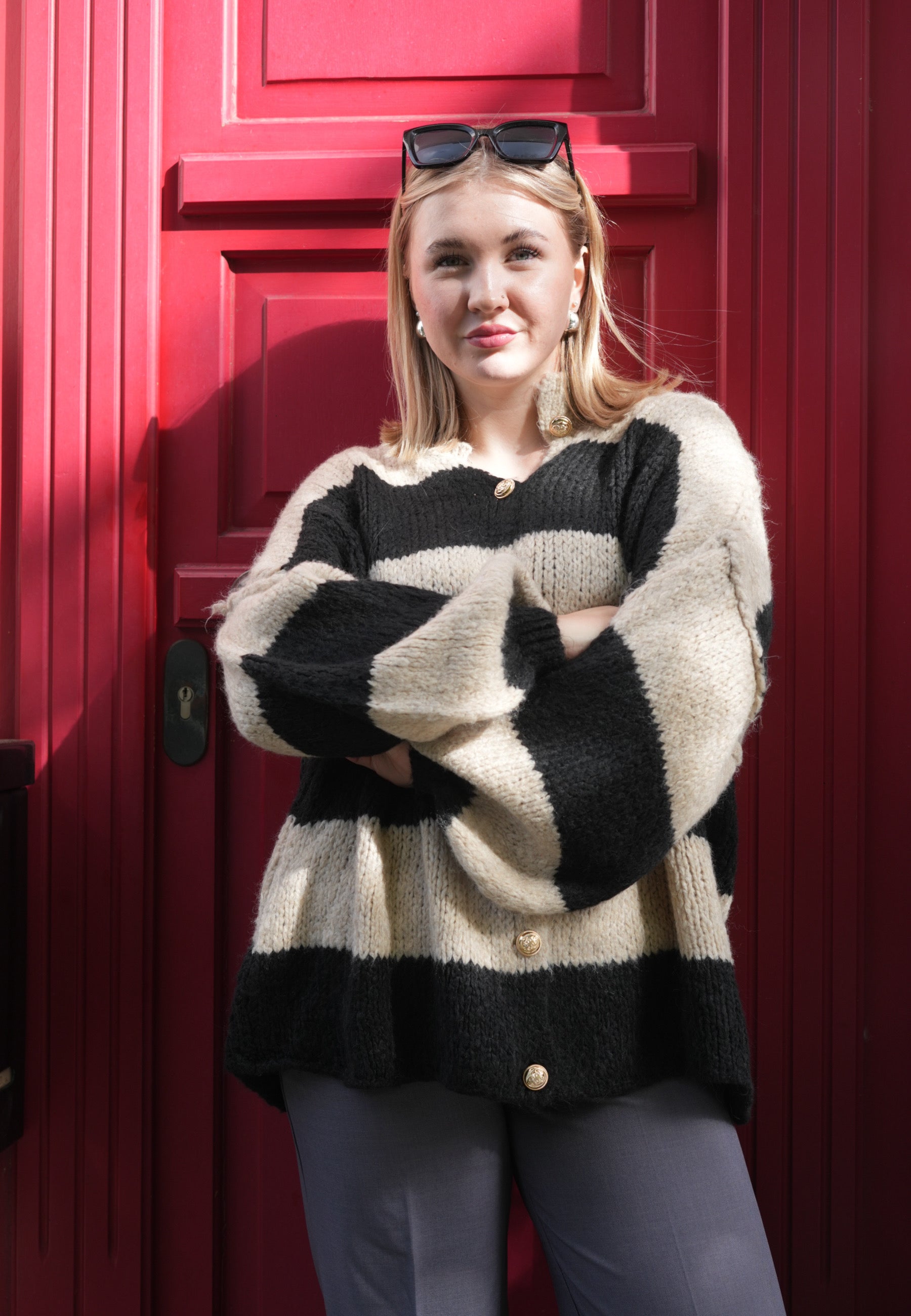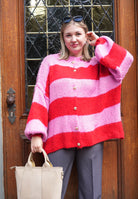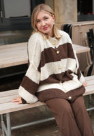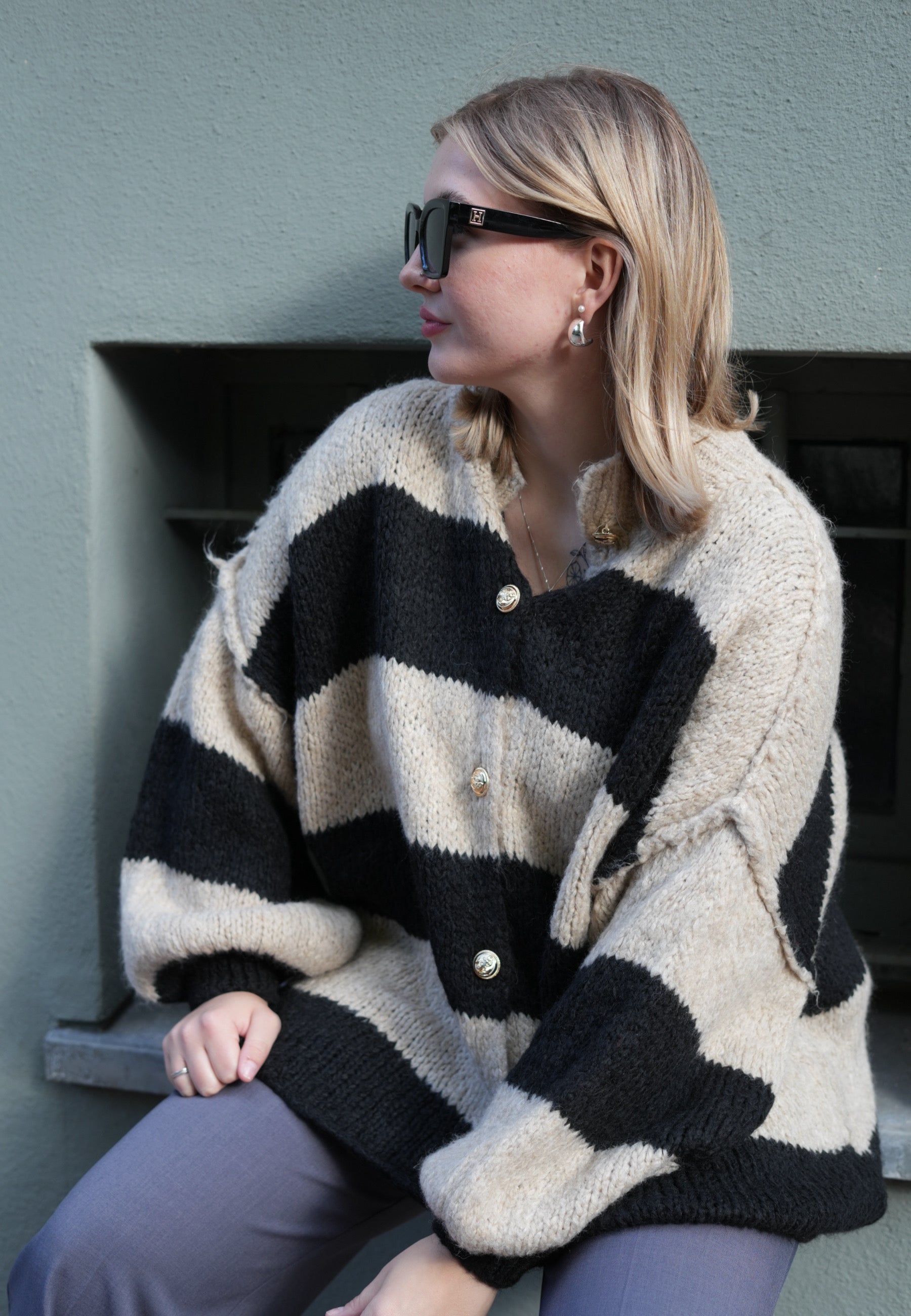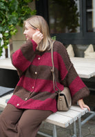 Gestreifte lange Strickjacke mit goldenen Knöpfen