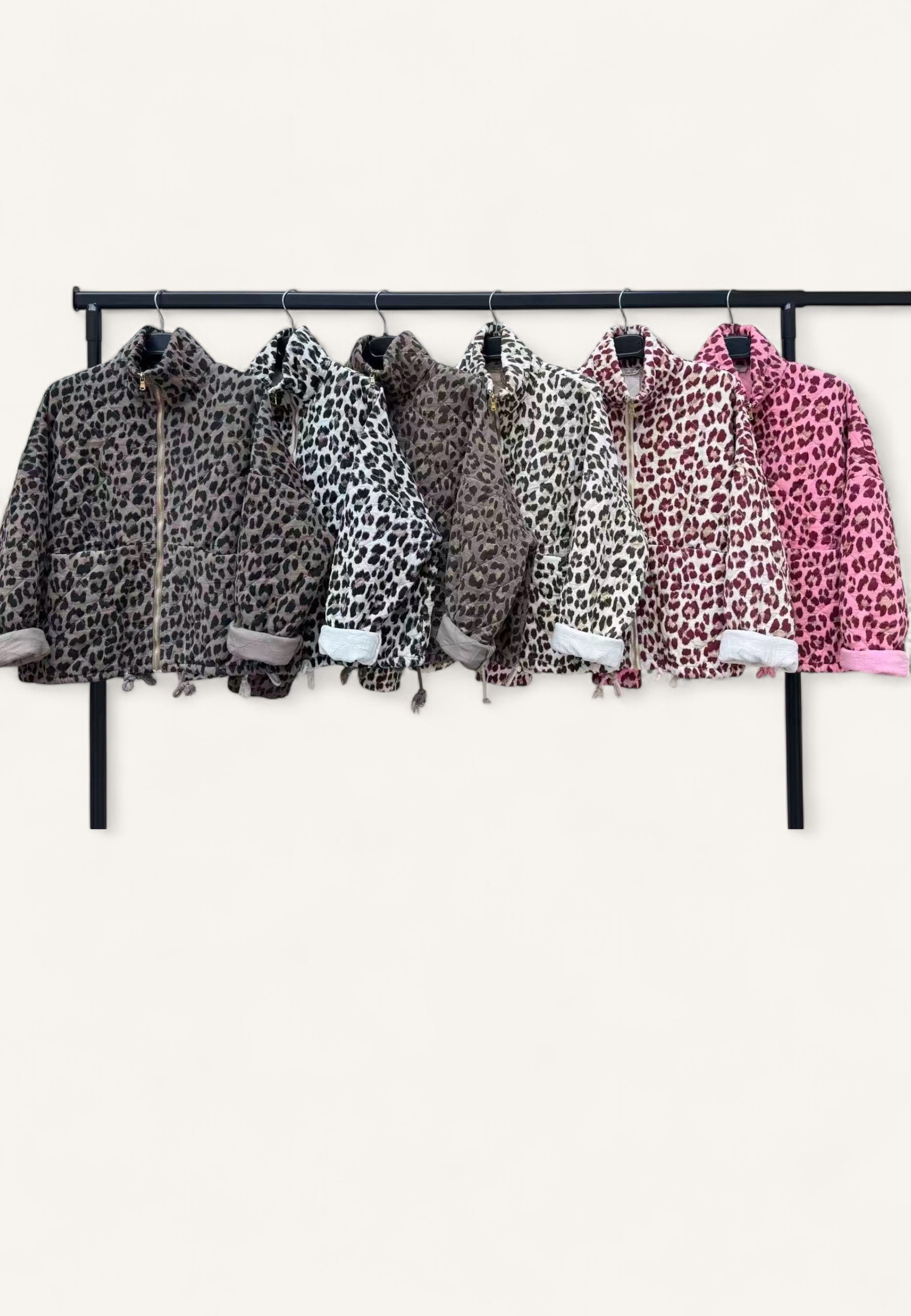 Jacke mit Leo, hohem Kragen. Aus weichem und leichtem Material, ideal für den Alltag. Feine Nähte und Kordelzug in der Taille für eine perfekte Passform.