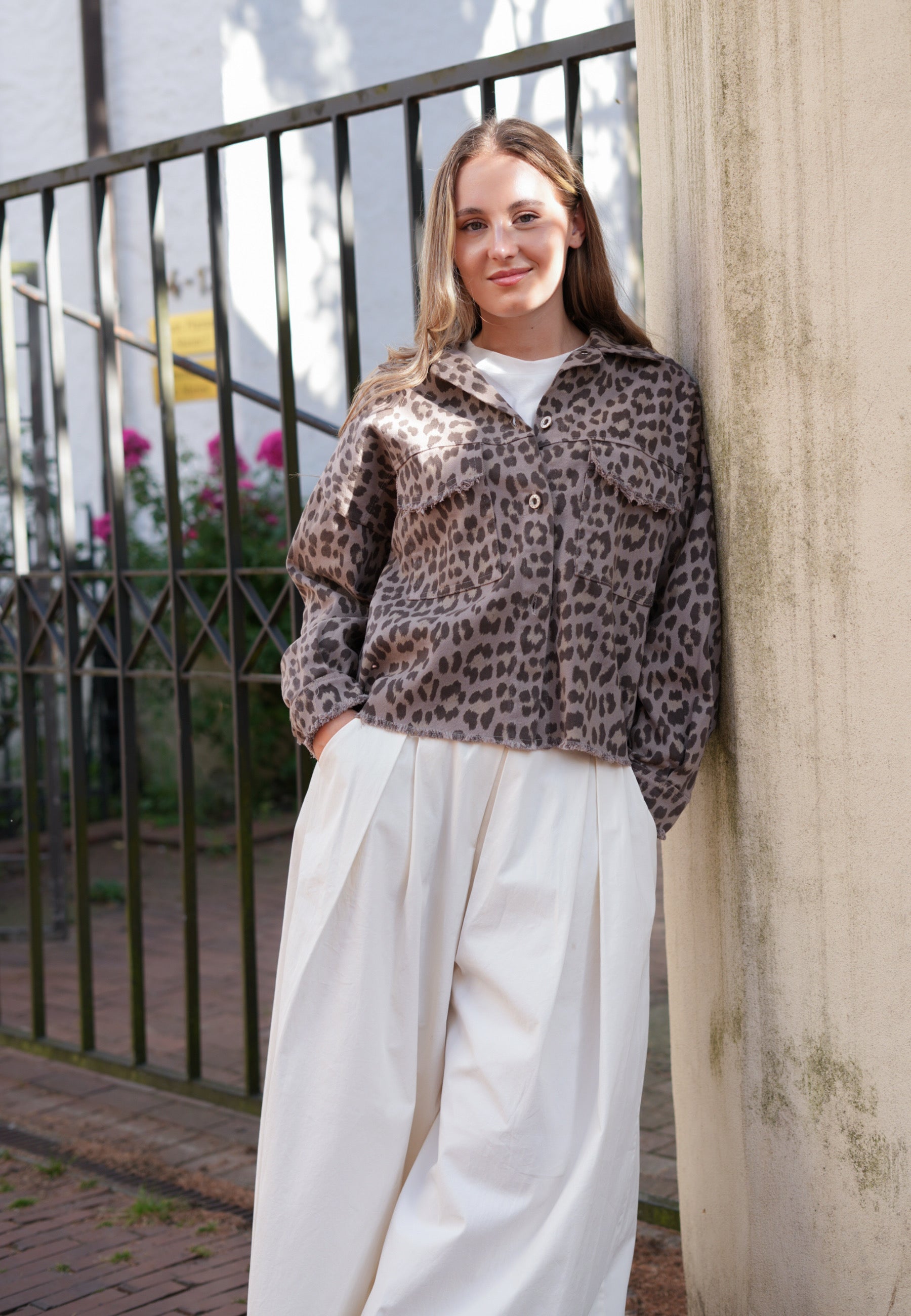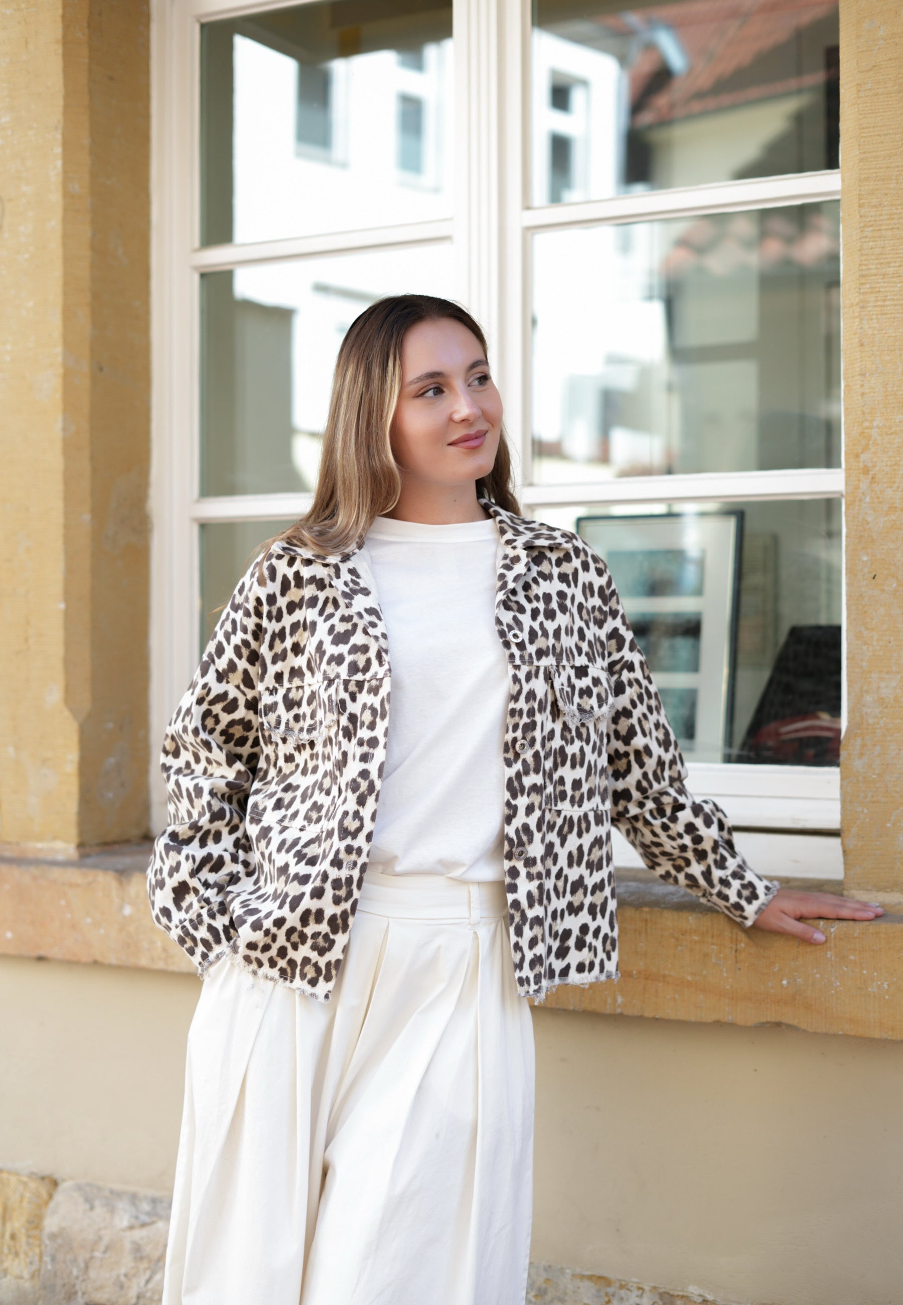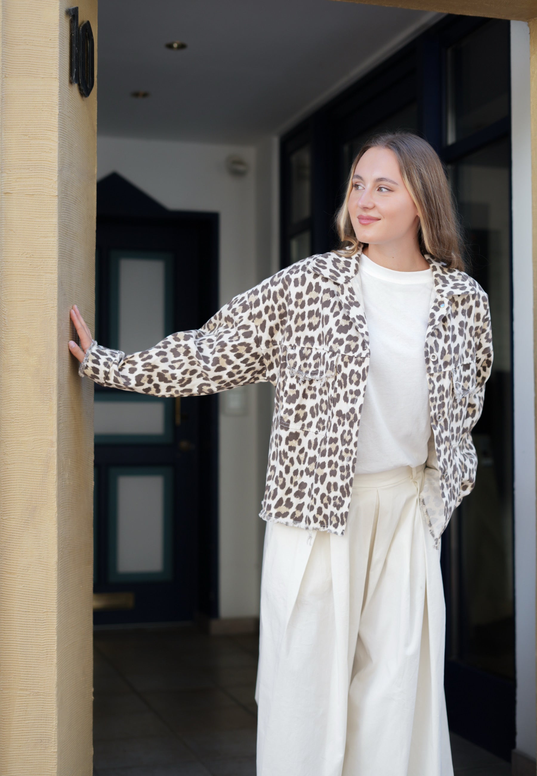 Leichte Jeansjacke im Leo Look mit zwei aufgesetzten Taschen und leicht ausgefransten Abschlüssen. Man kann die Jacke auch super als Hemd tragen.