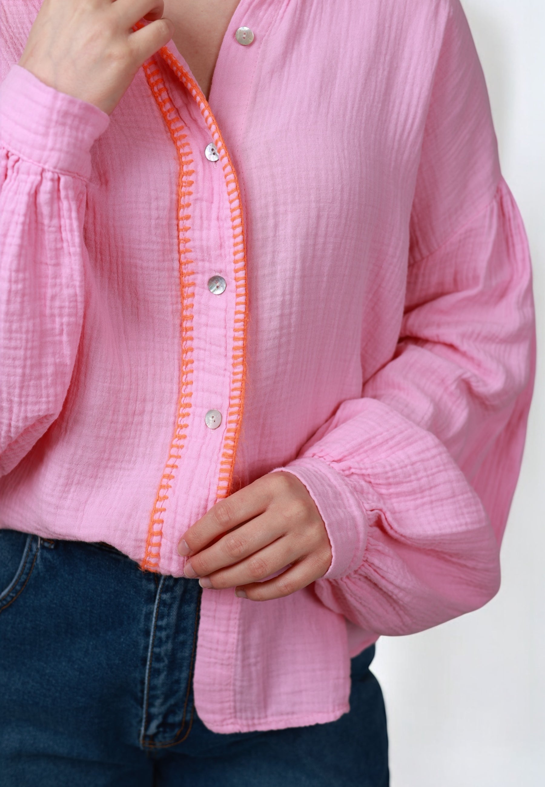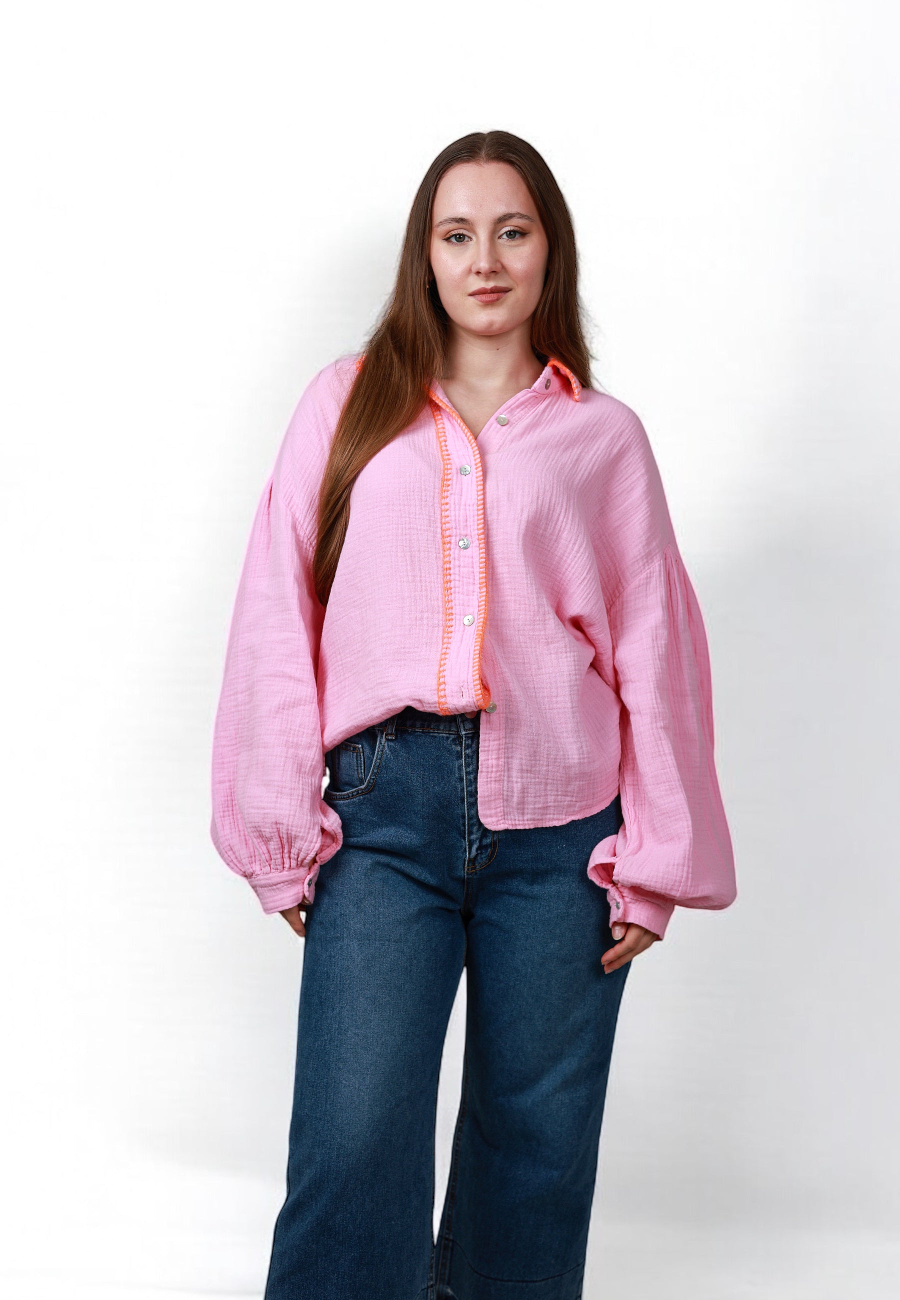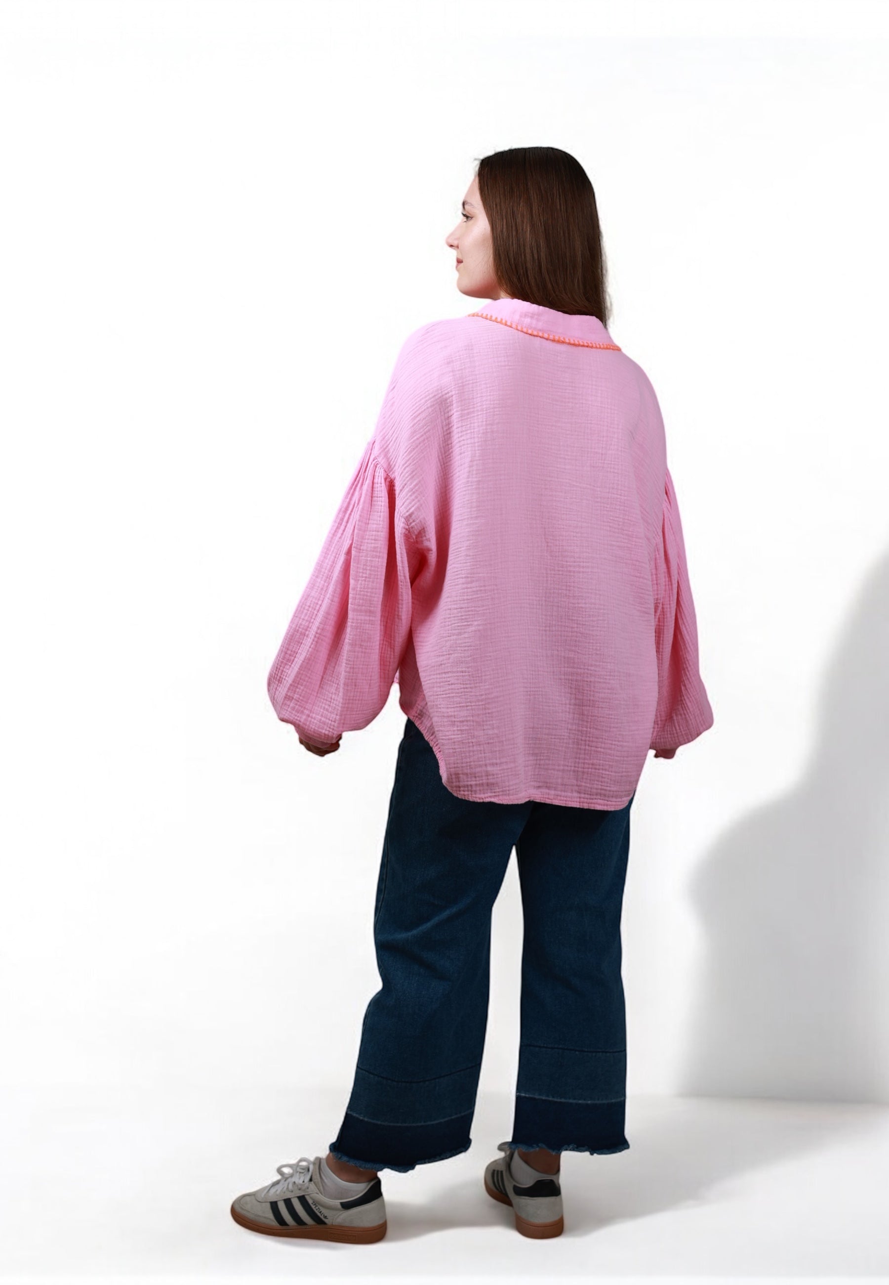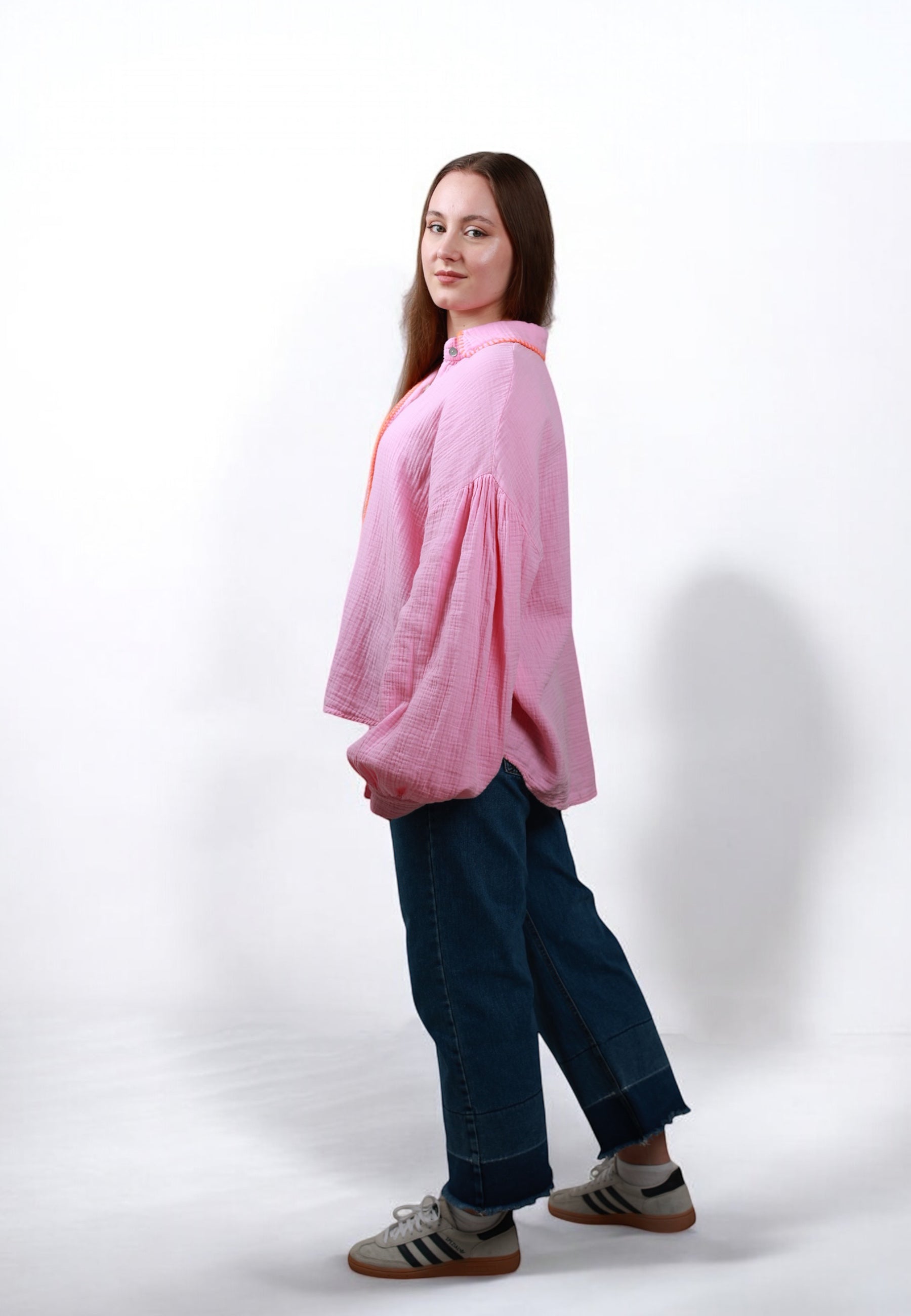 Musselin Bluse Oversize - Rosa Rosa mit Orangelinien