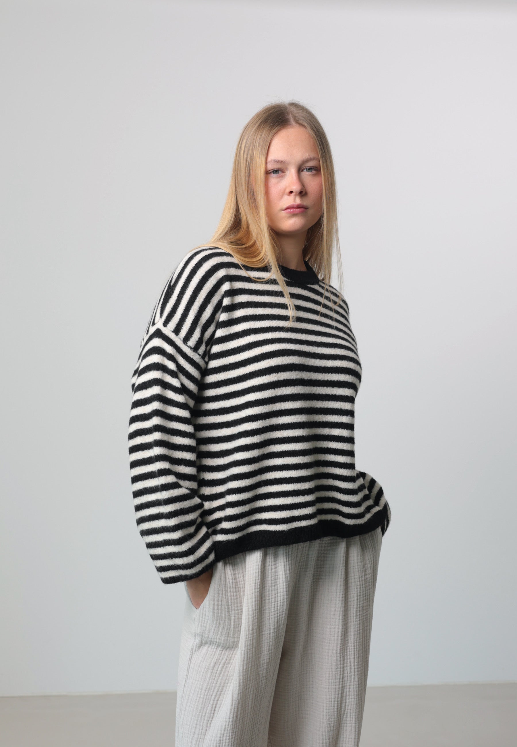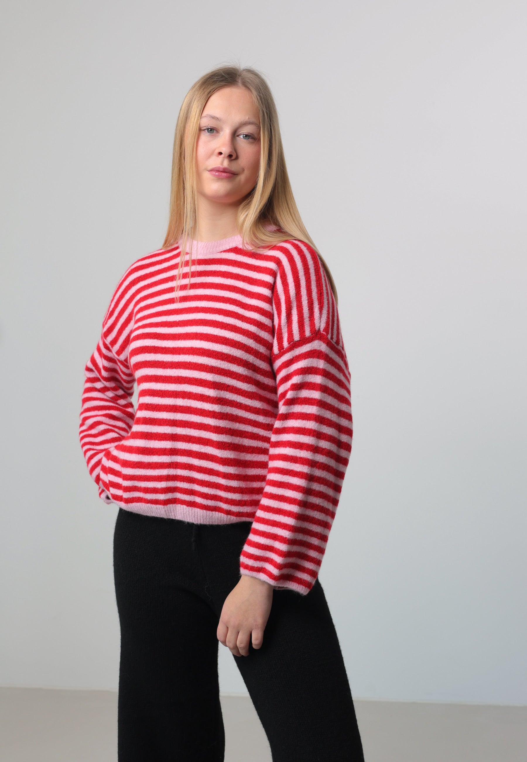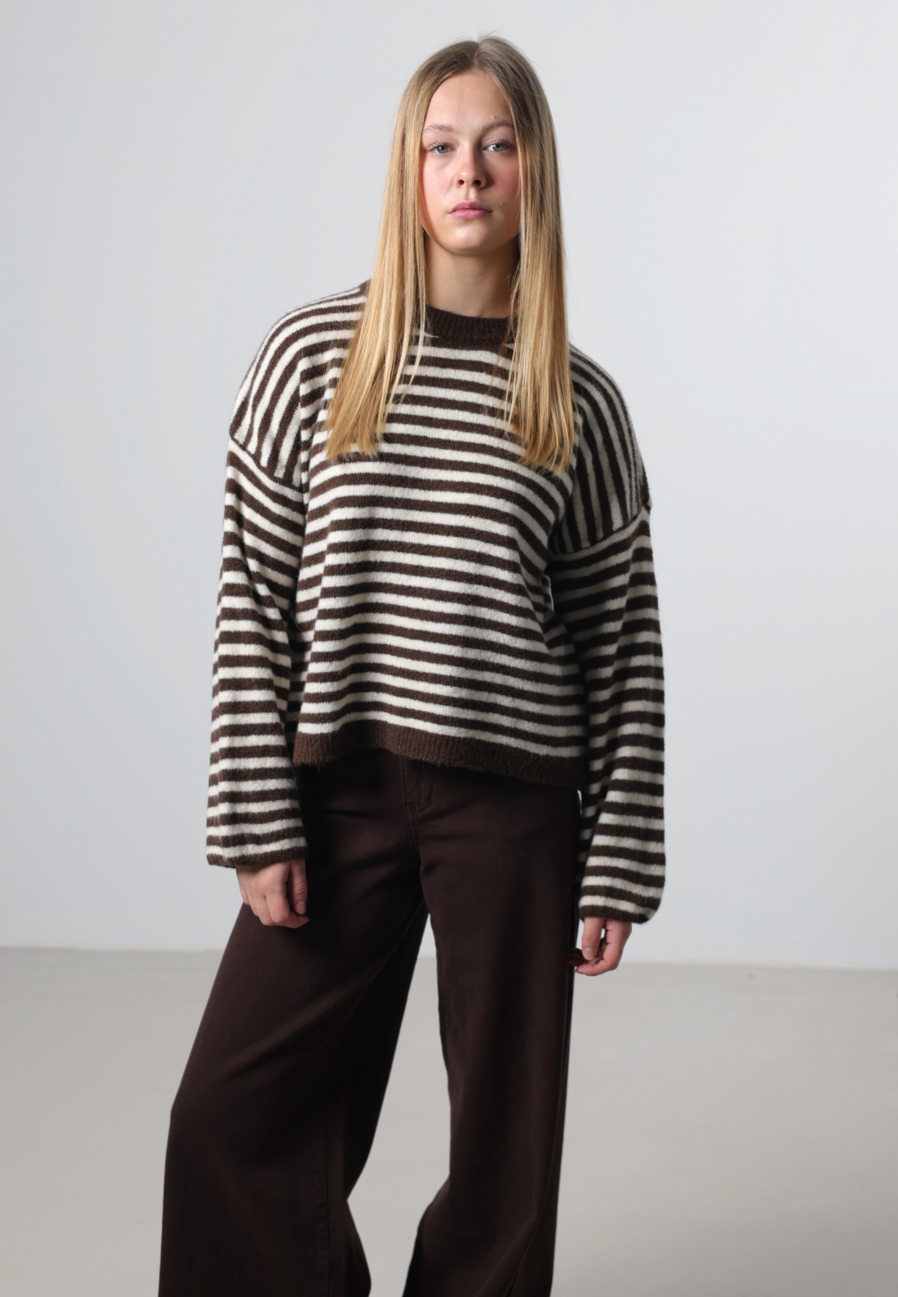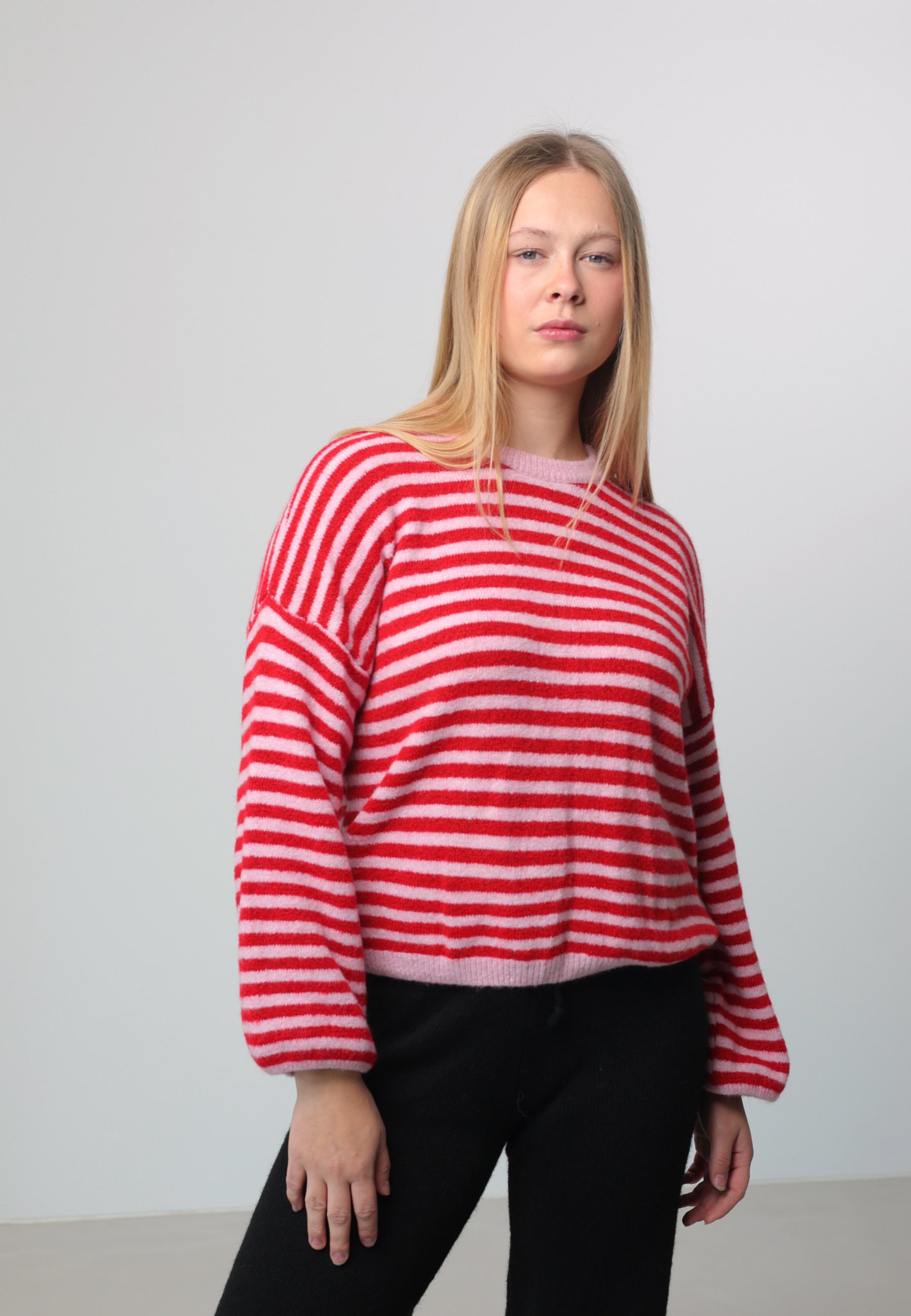 Ein modischer Strickpullover mit harmonischem Streifendesign. Der locker fallende Schnitt mit weiten Ärmeln sorgt für einen lässigen Look und ist ideal für stylishe Layering-Outfits. Das Material ist angenehm weich, formstabil und perfekt für den Alltag.