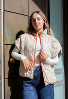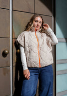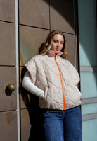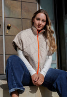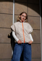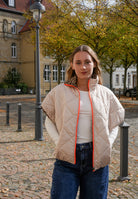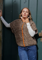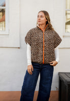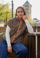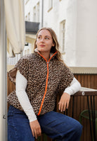 Trendige, kurze wattierte Steppweste LEO/NEON mit allover Leoprint. Stehkragen und kurze, überschnittene Ärmel. Besonderes Detail: Reißverschluss in neon Farben! 💕