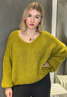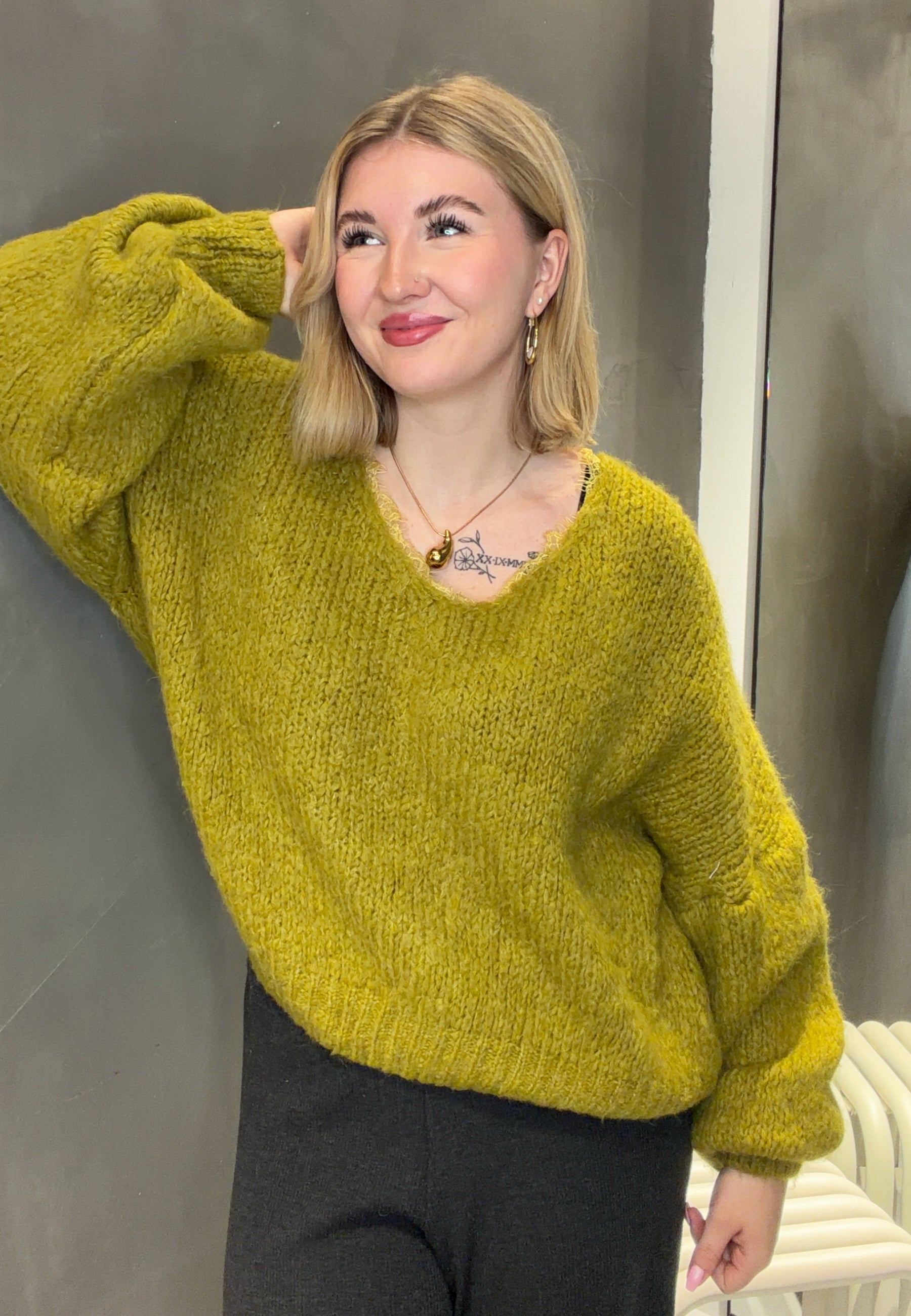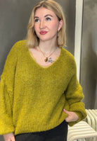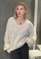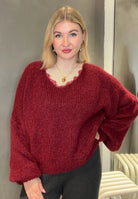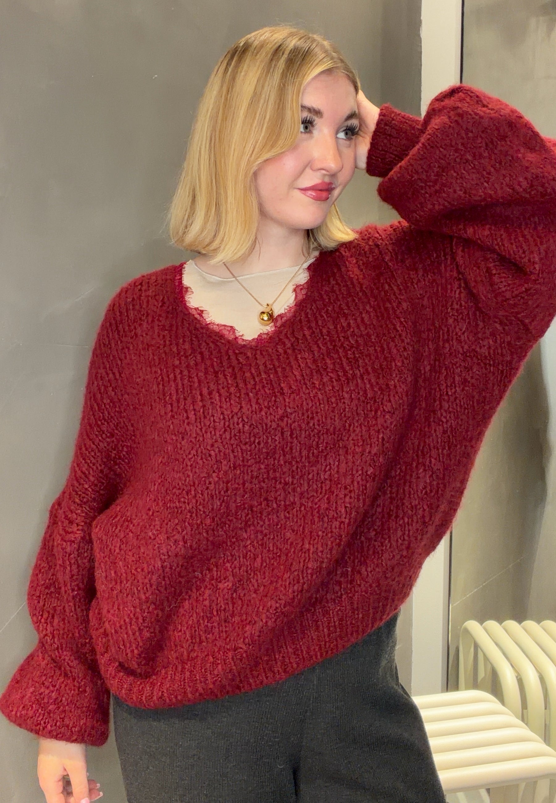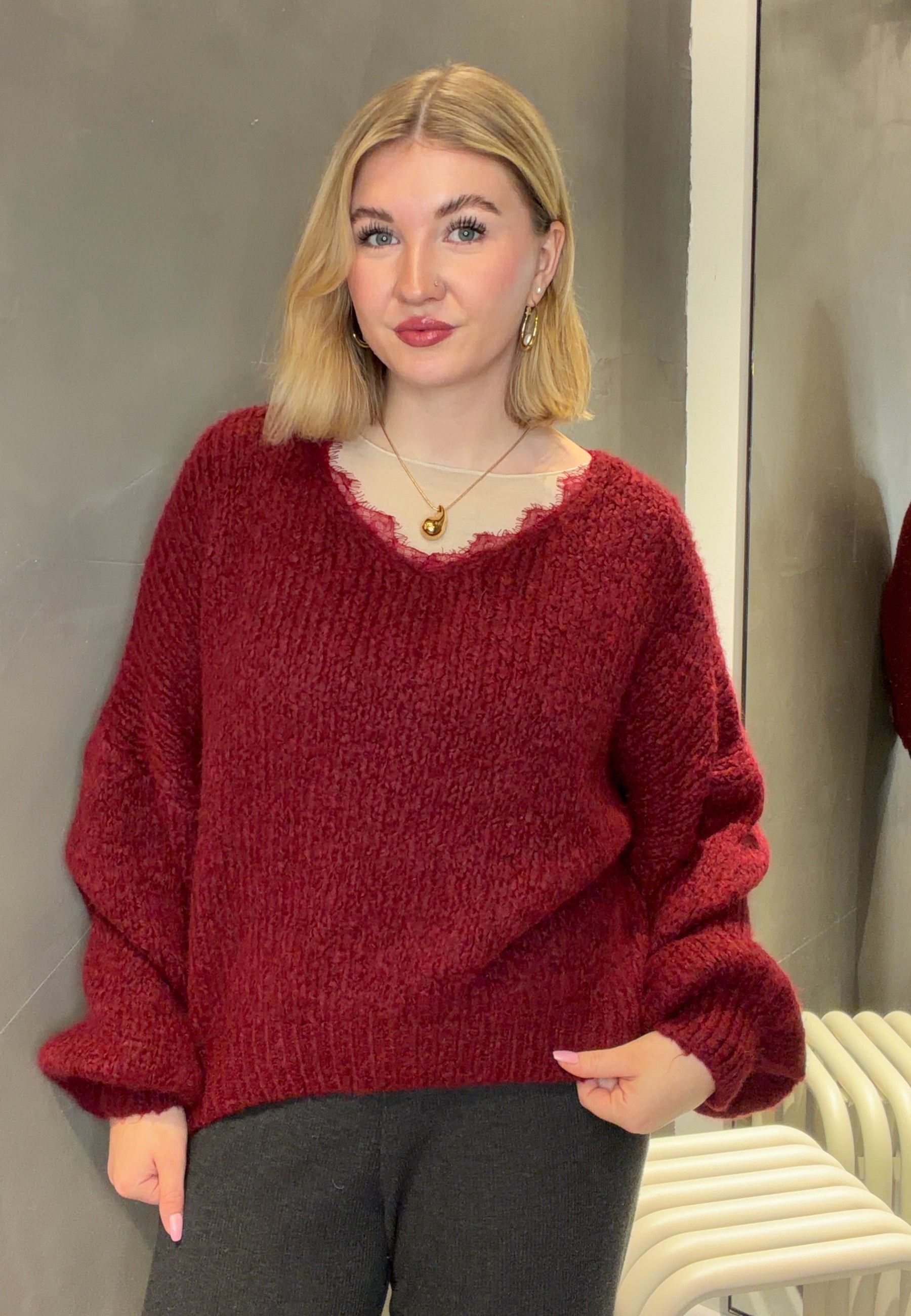 Dieser flauschige Strickpullover überzeugt mit seinem lockeren Schnitt, eleganten Ballonärmeln und einem tiefen V-Ausschnitt mit feiner Spitzenapplikation. Perfekt für gemütliche Alltagslooks genauso wie für stilvolle Auftritte.