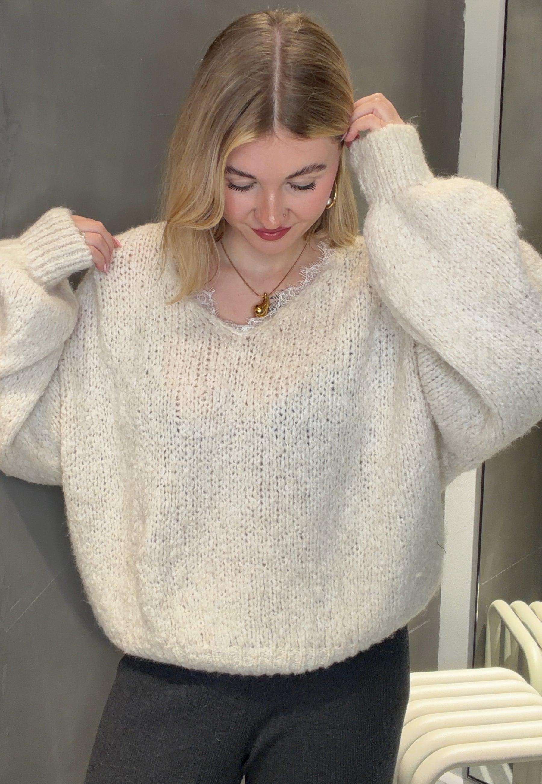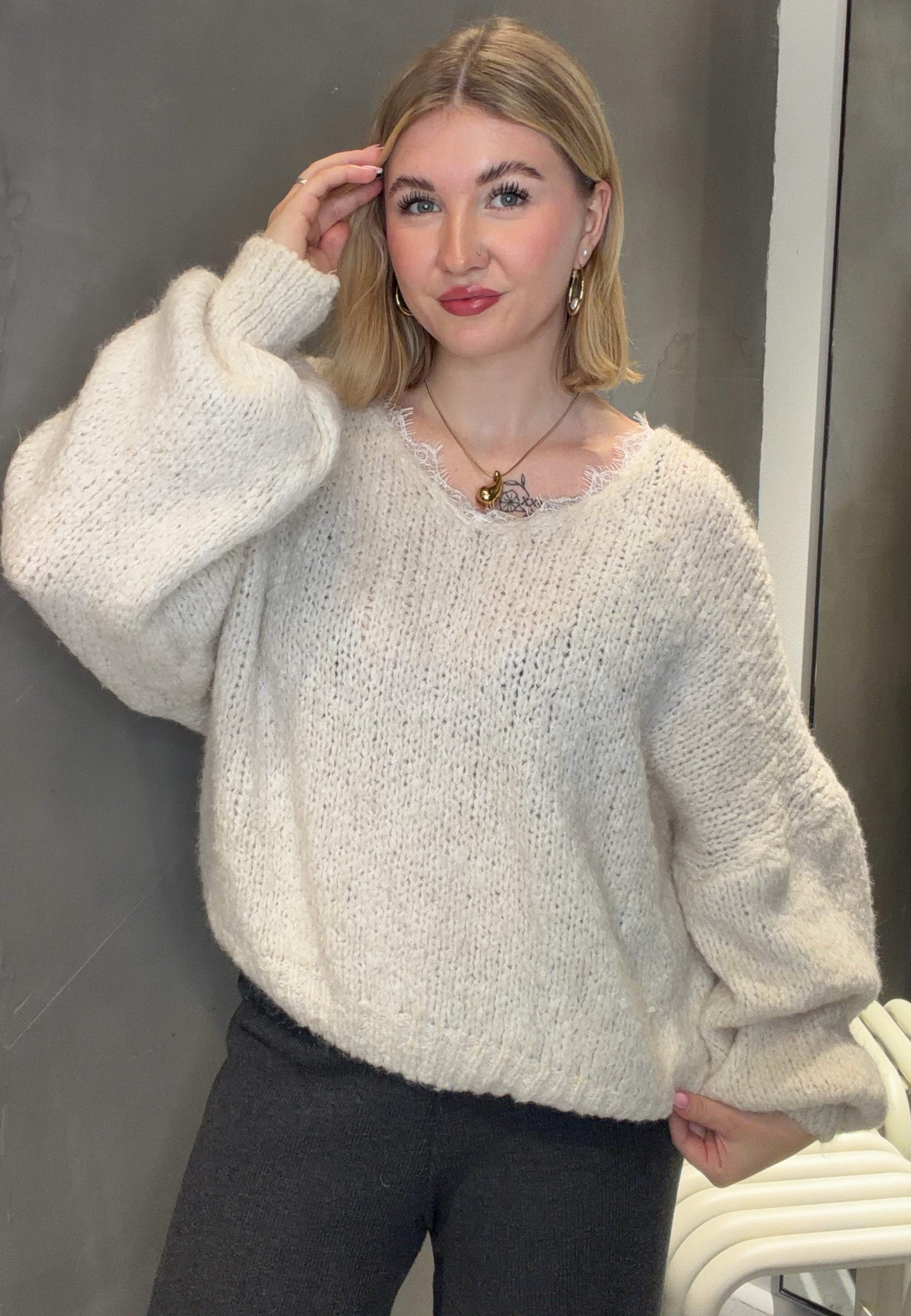 Kuscheliger Strickpullover mit Spitze & Ballonärmeln