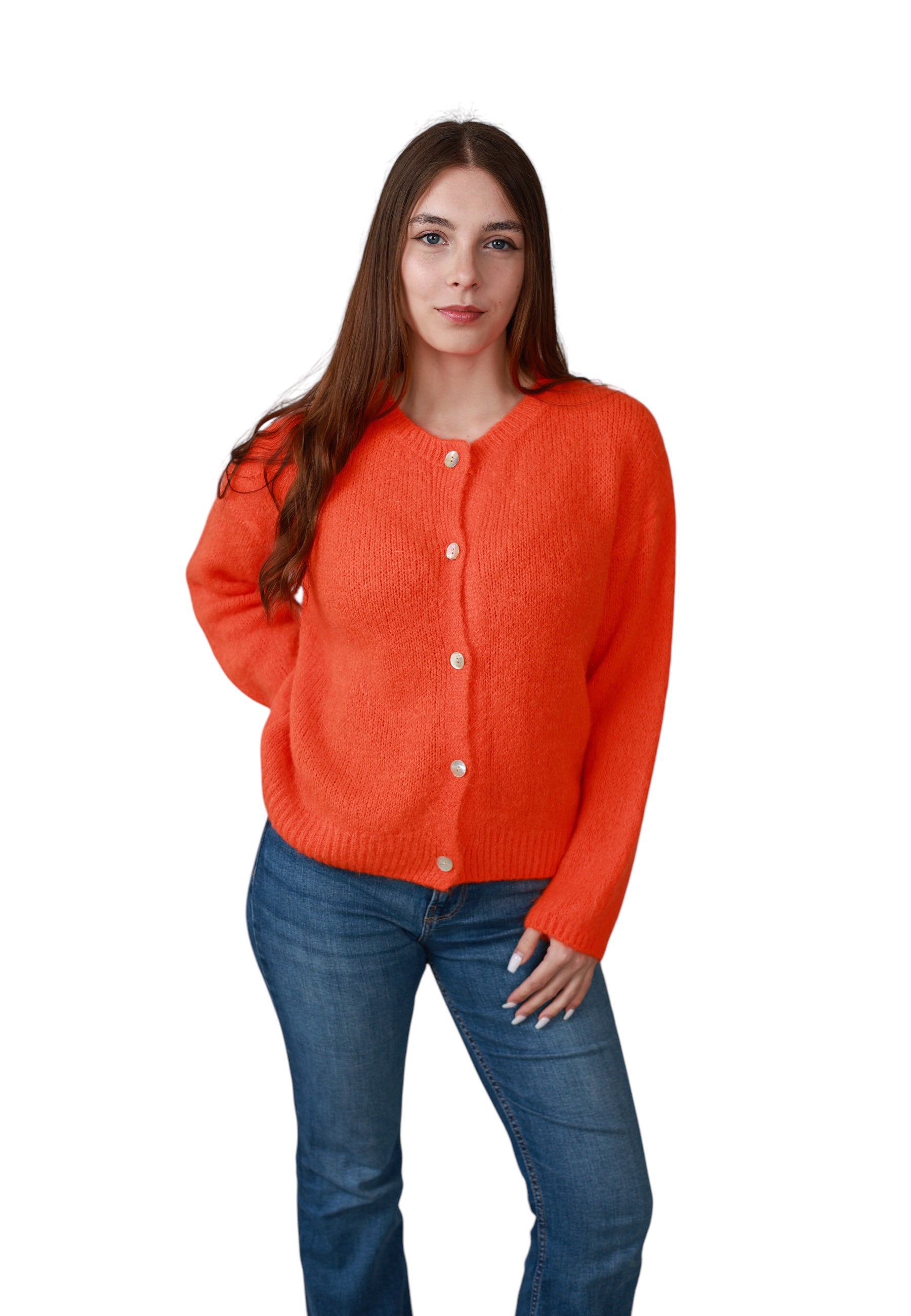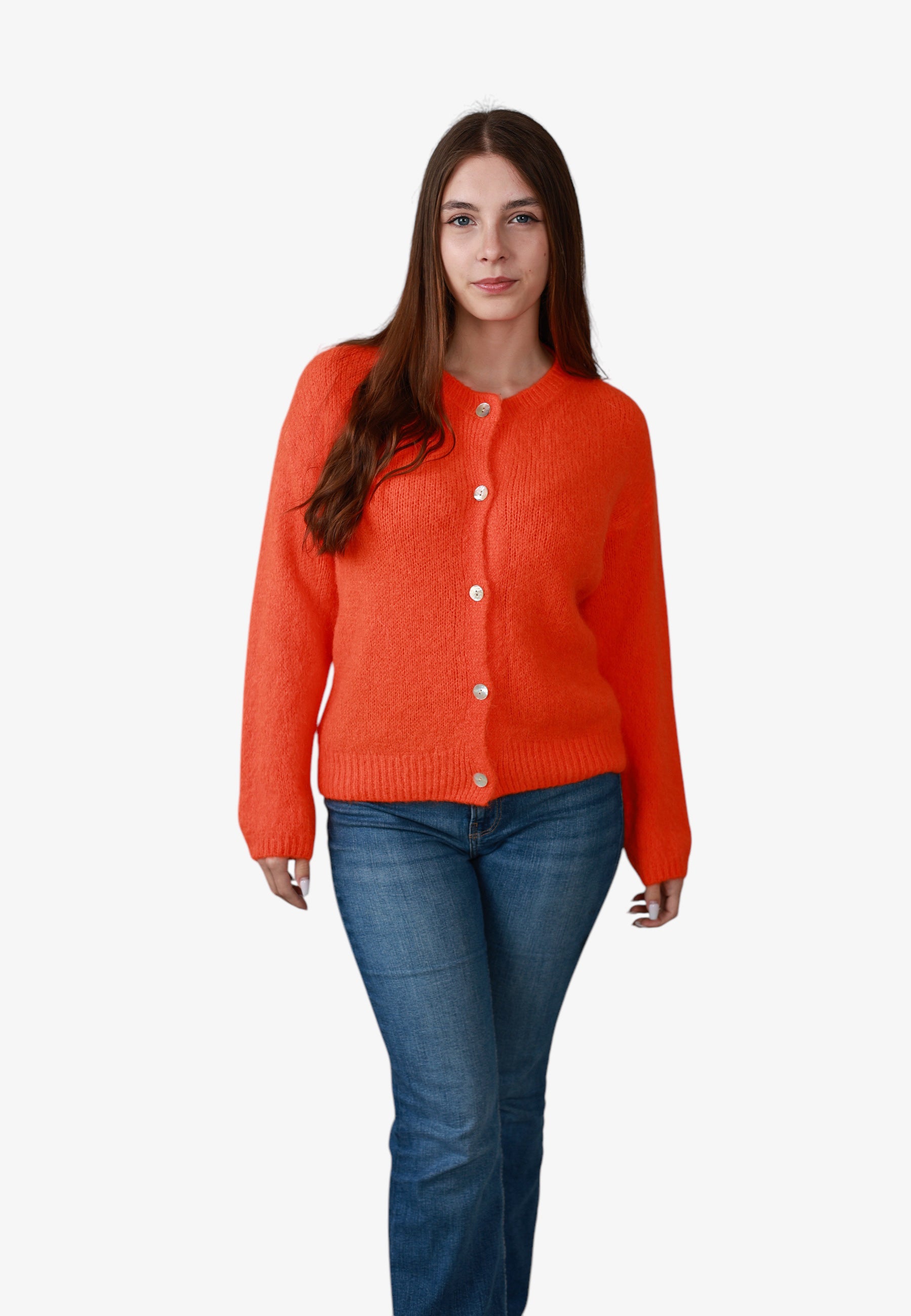 - Cristina ist 1,60m groß und trägt die Strickjacke.