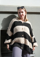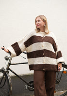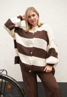 Gestreifte lange Strickjacke mit goldenen Knöpfen