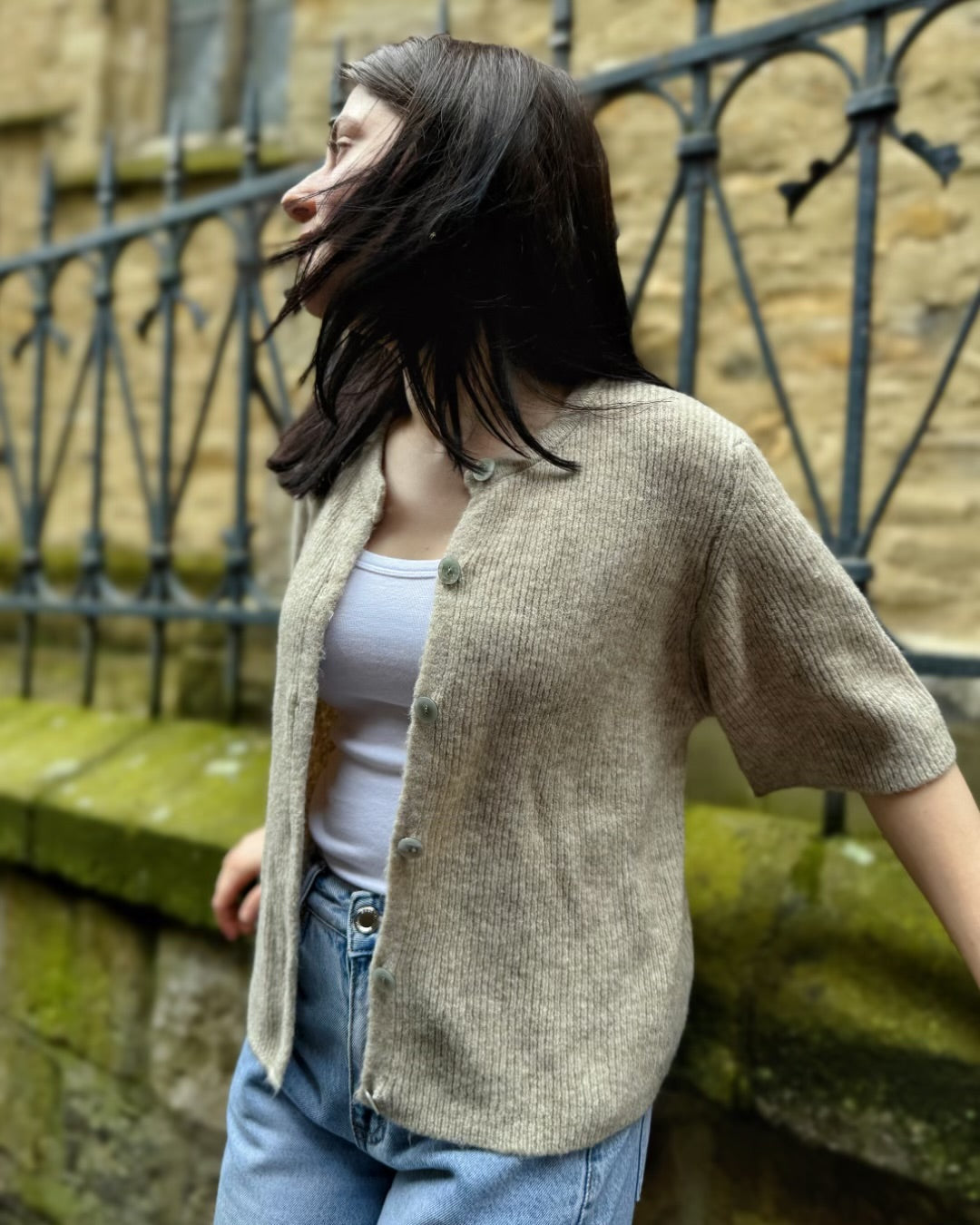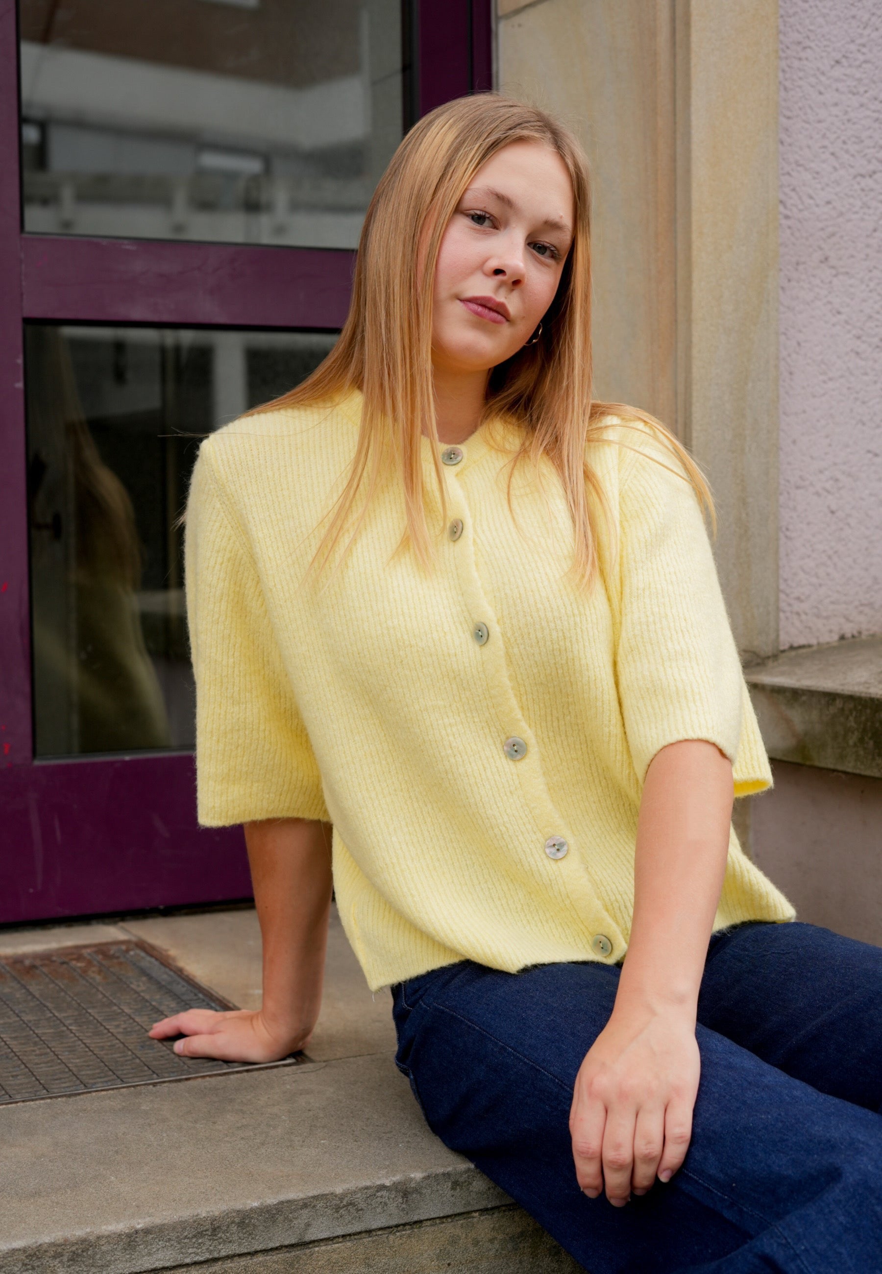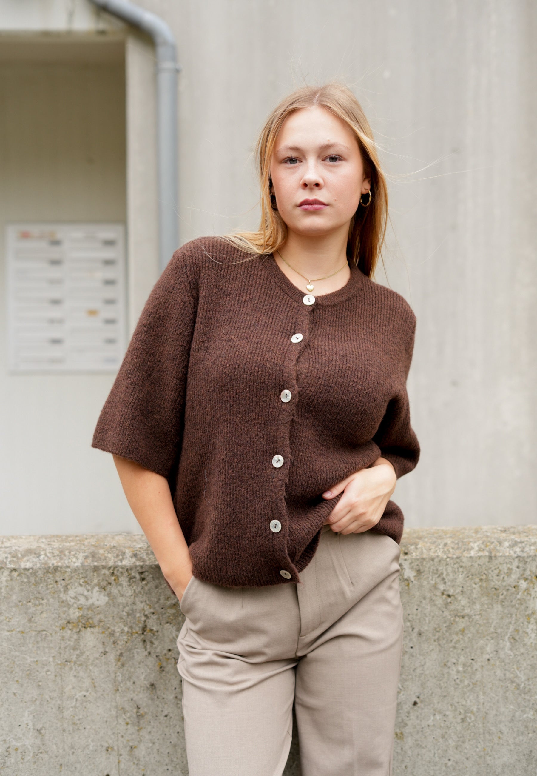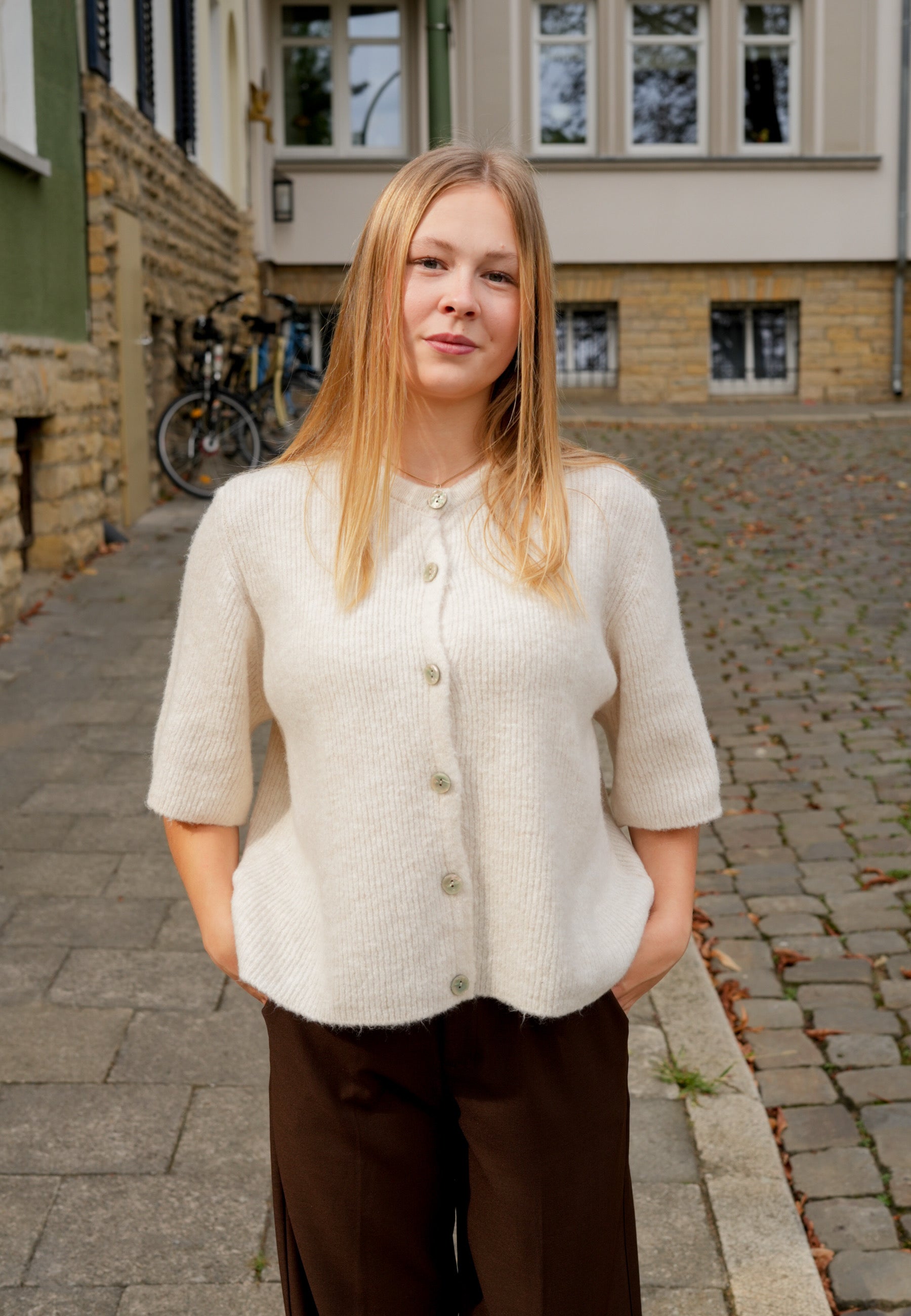 - Cordelia ist 1,67m groß und trägt die Strickjacke.