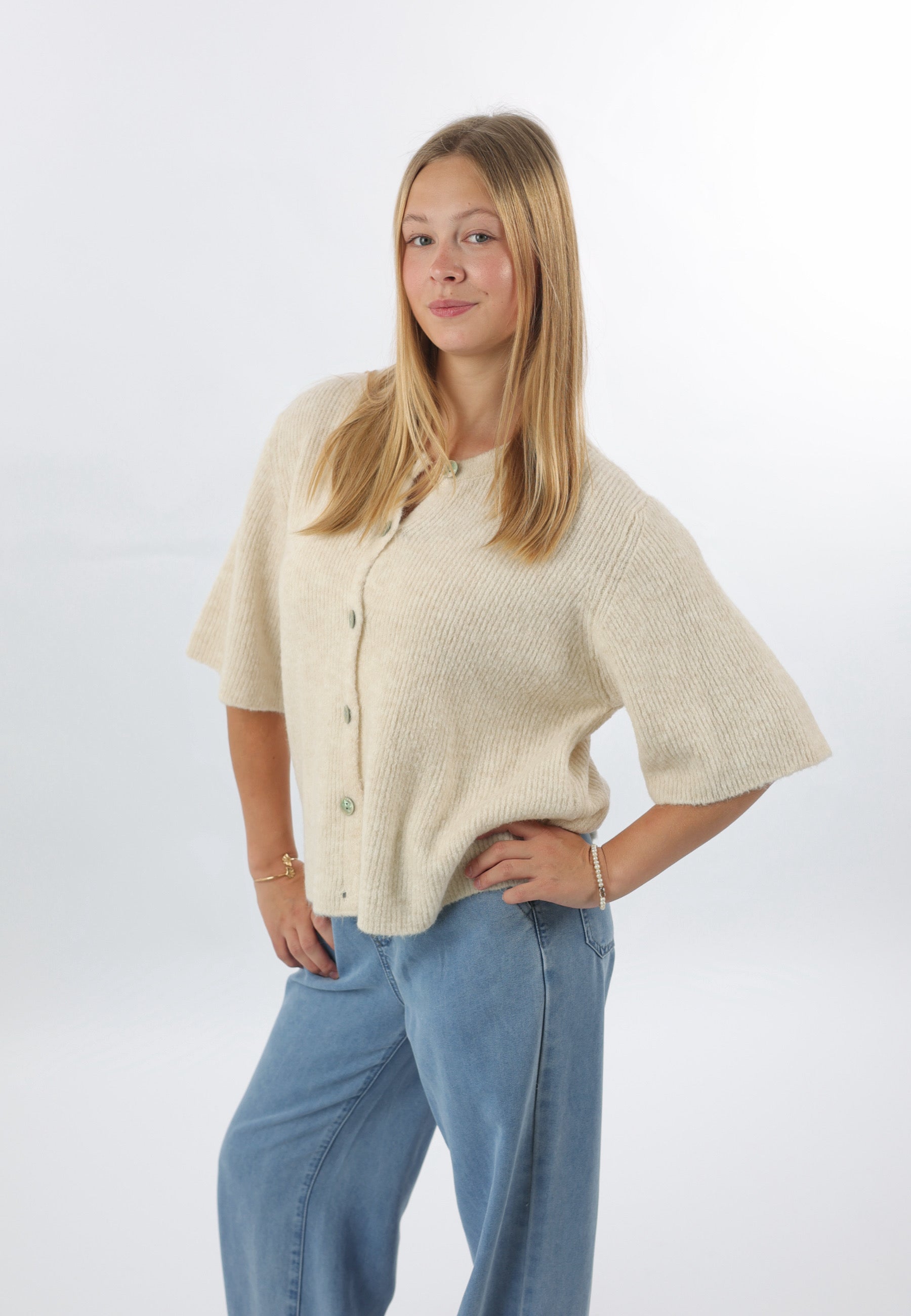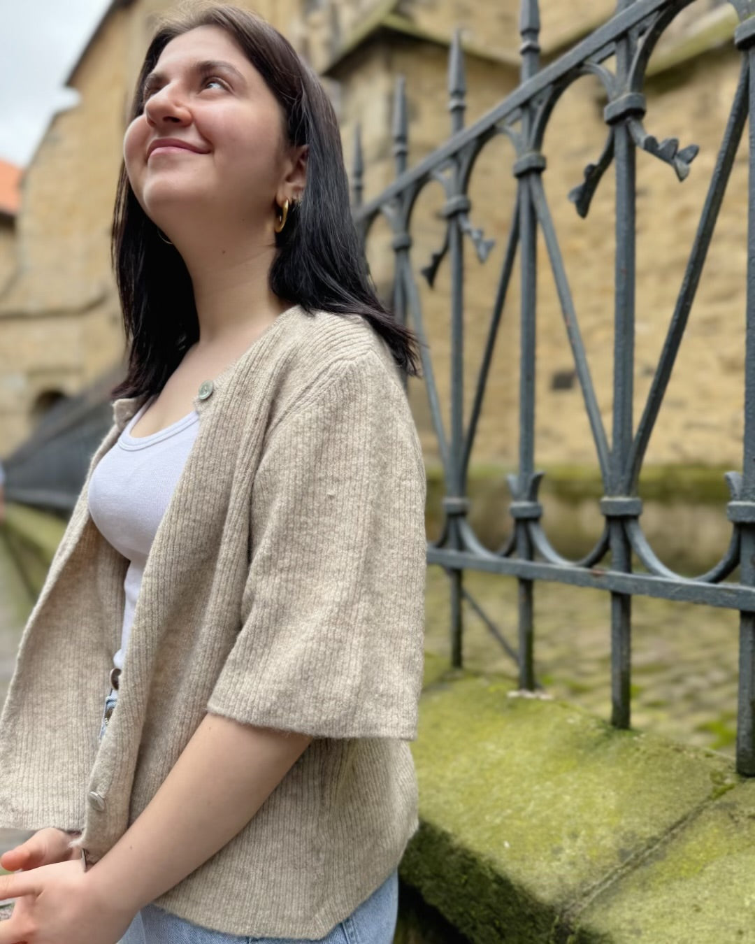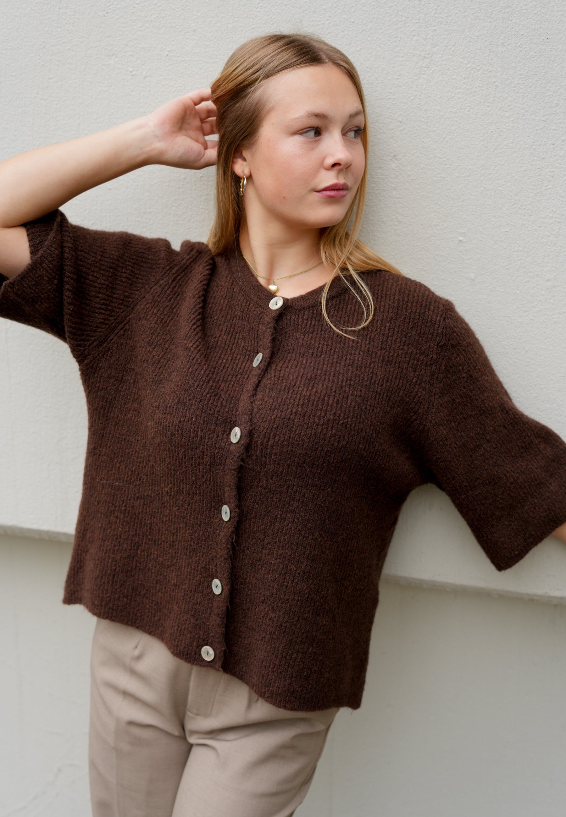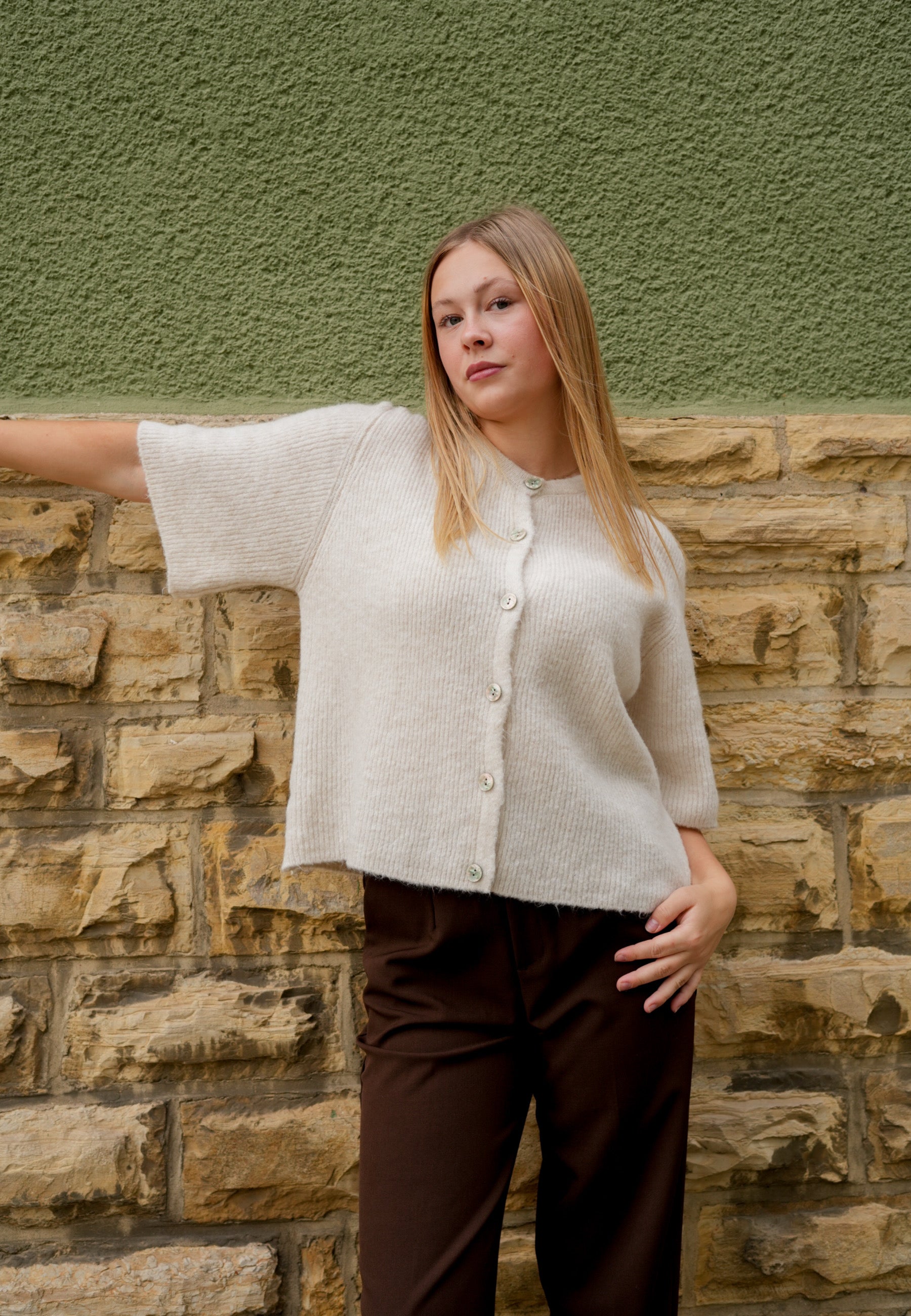 - Cordelia ist 1,67m groß und trägt die Strickjacke.