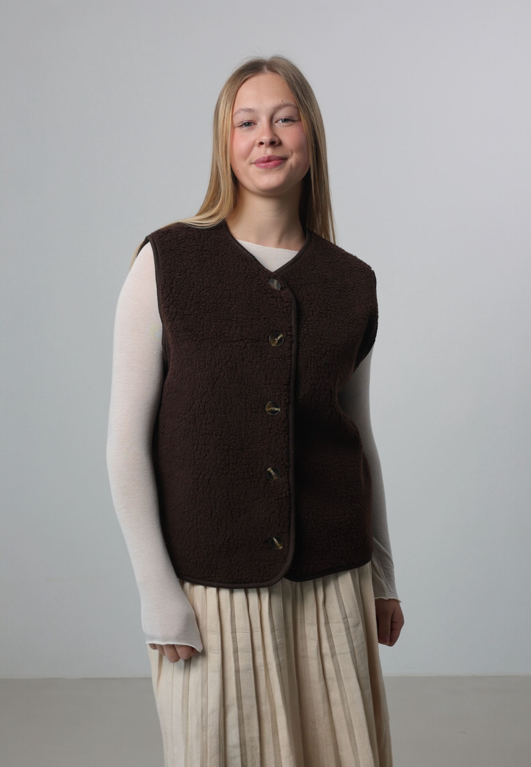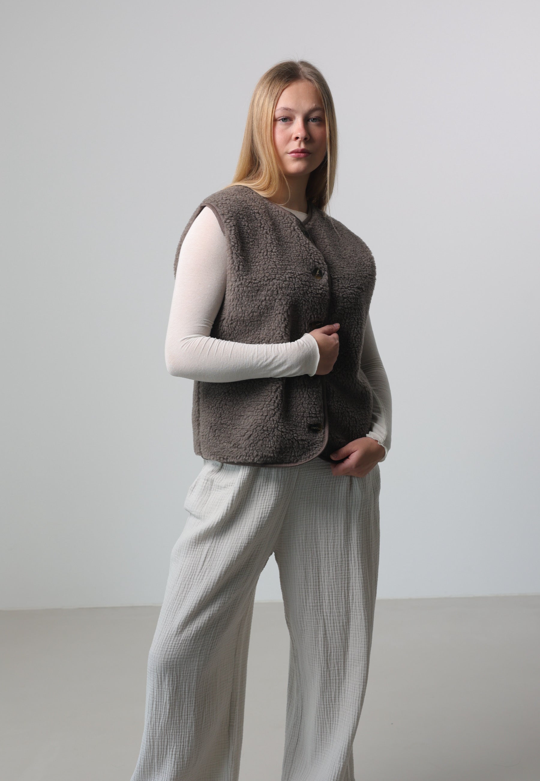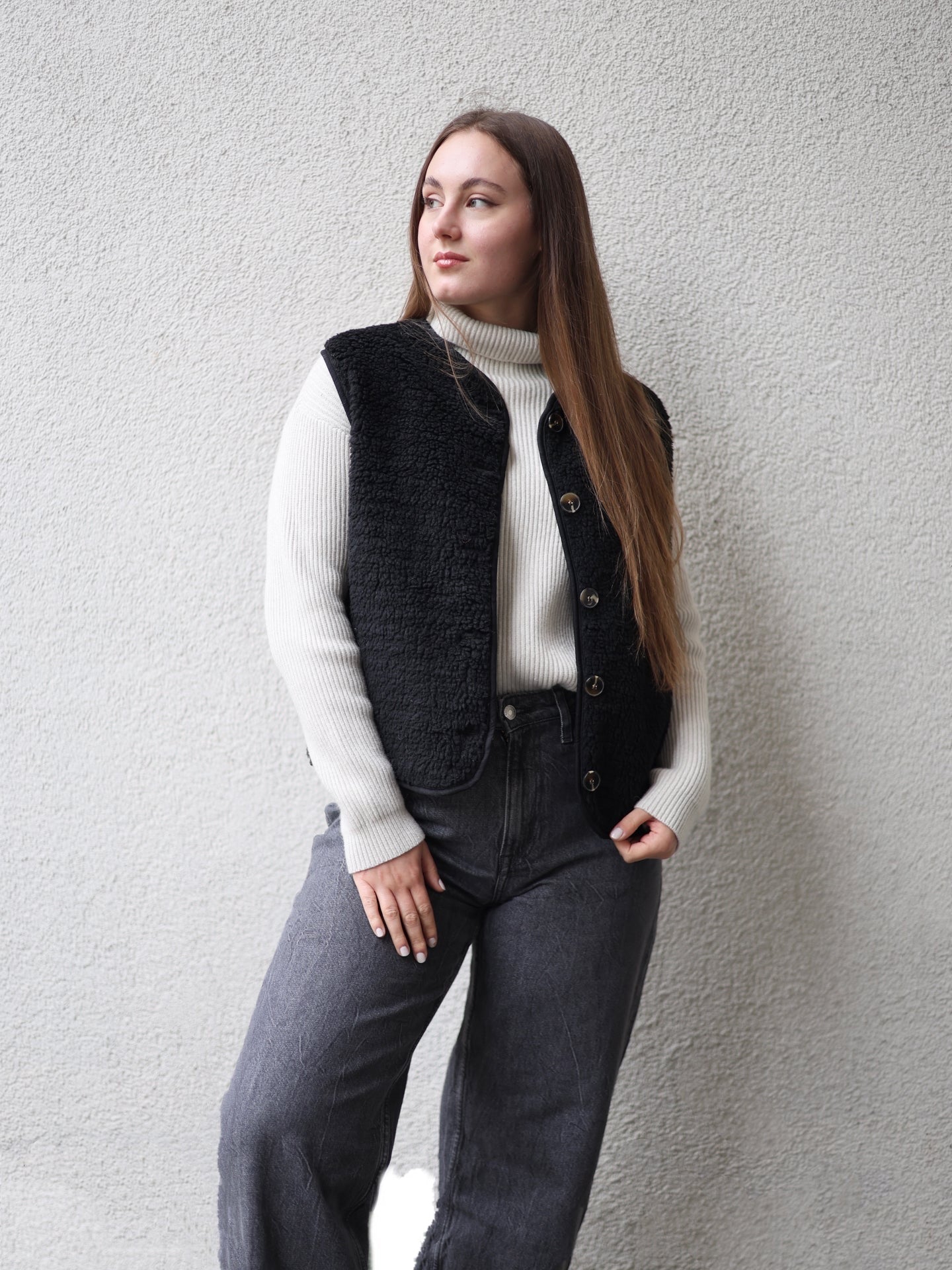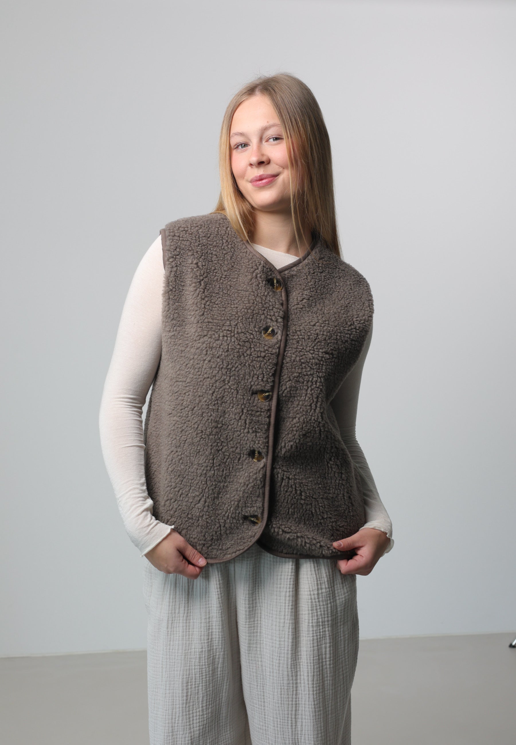 - Cordelia ist 1,67m groß und trägt die Teddyweste.