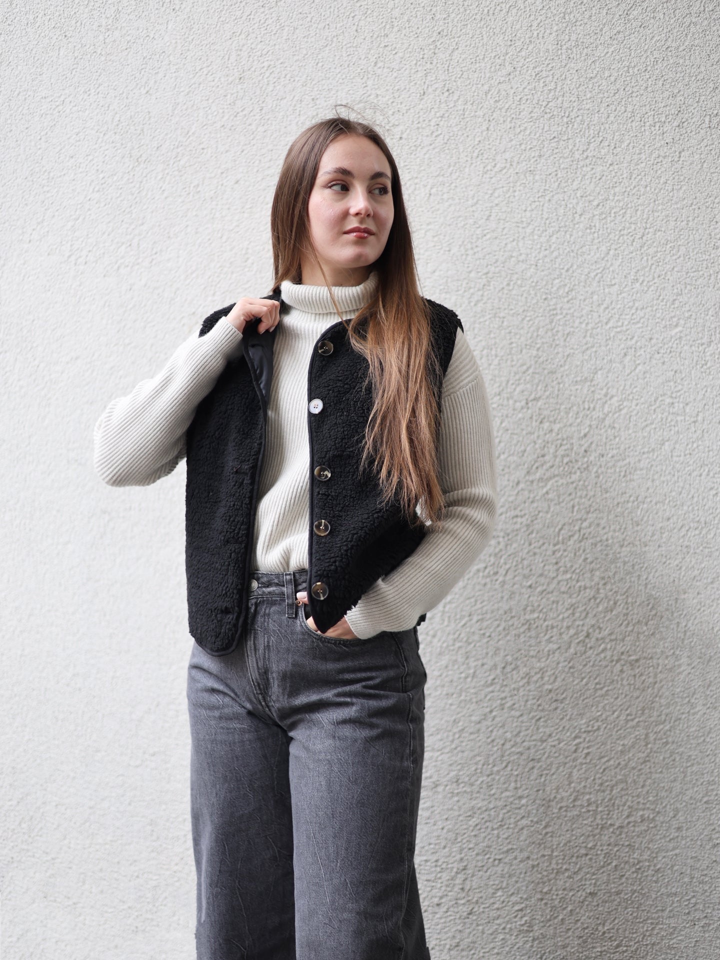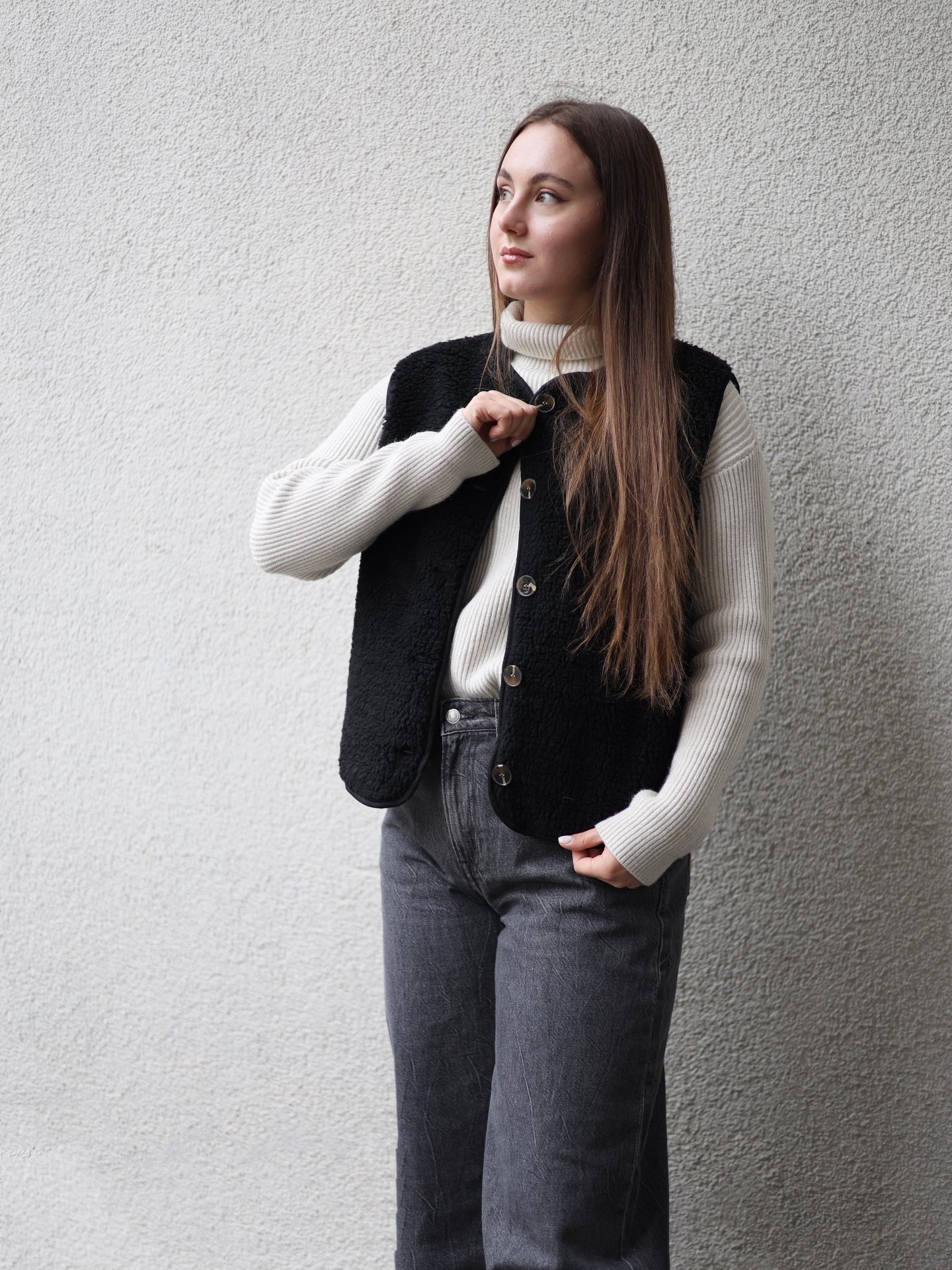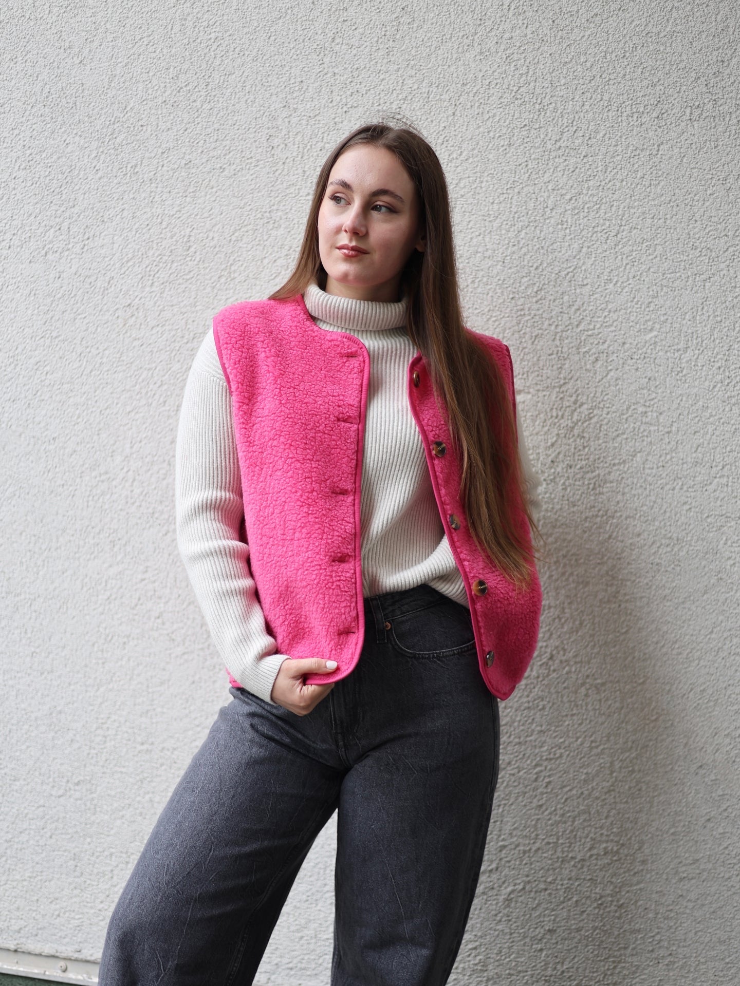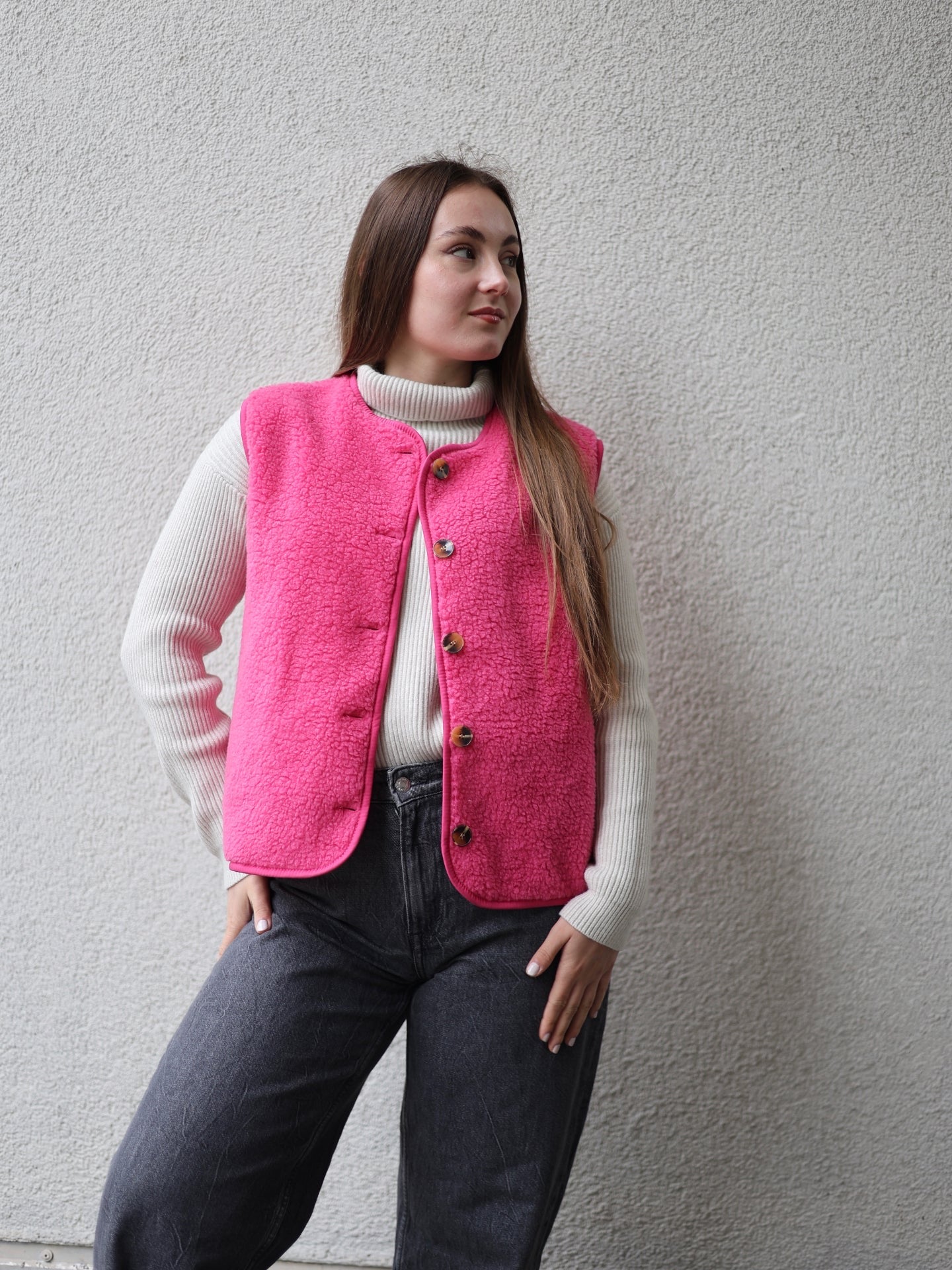 - Cordelia ist 1,67m groß und trägt die Teddyweste.