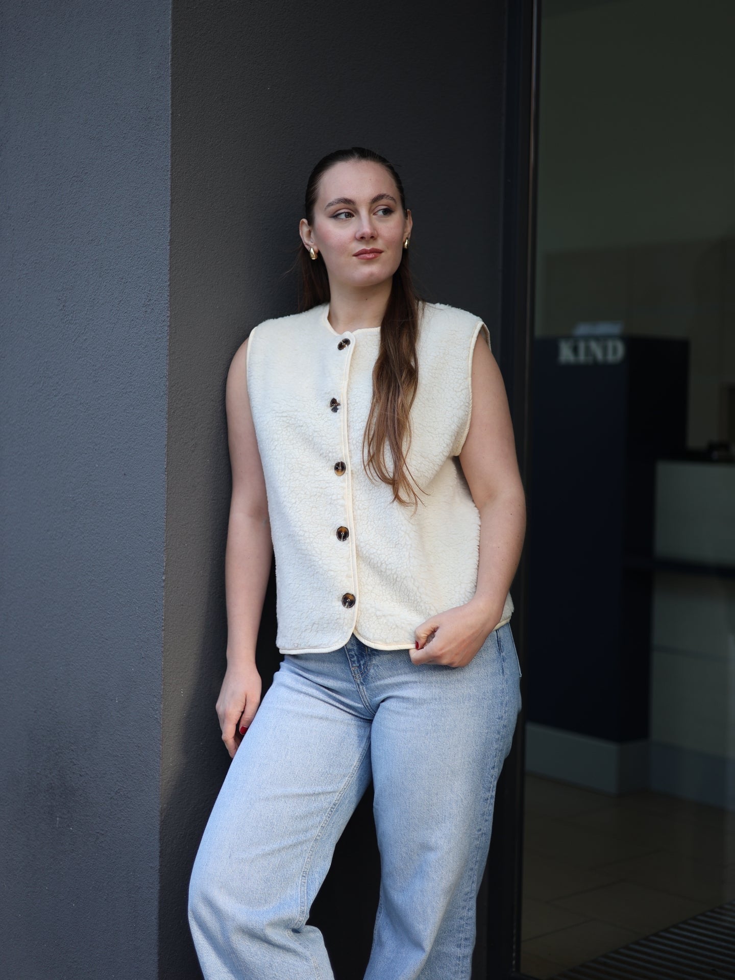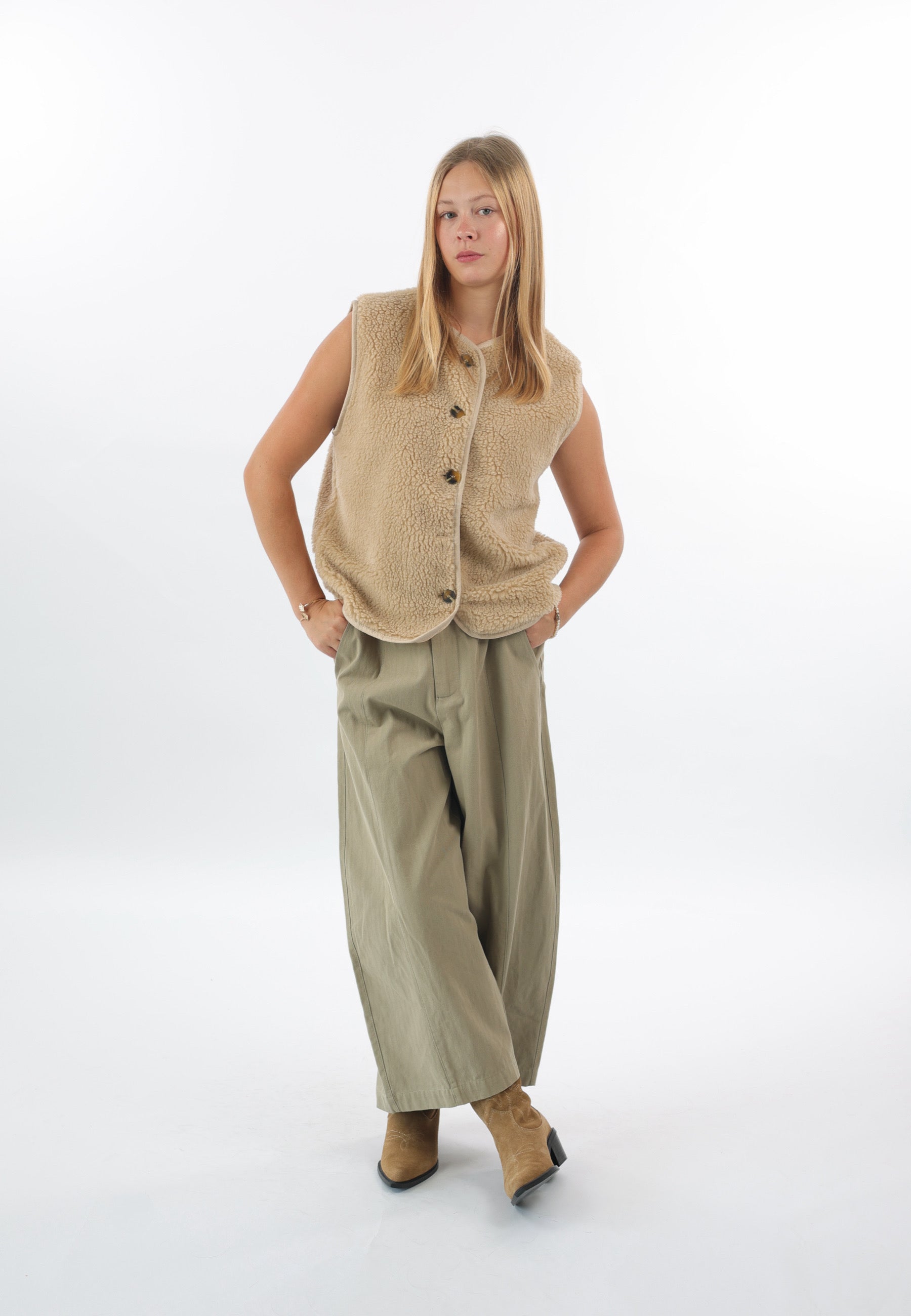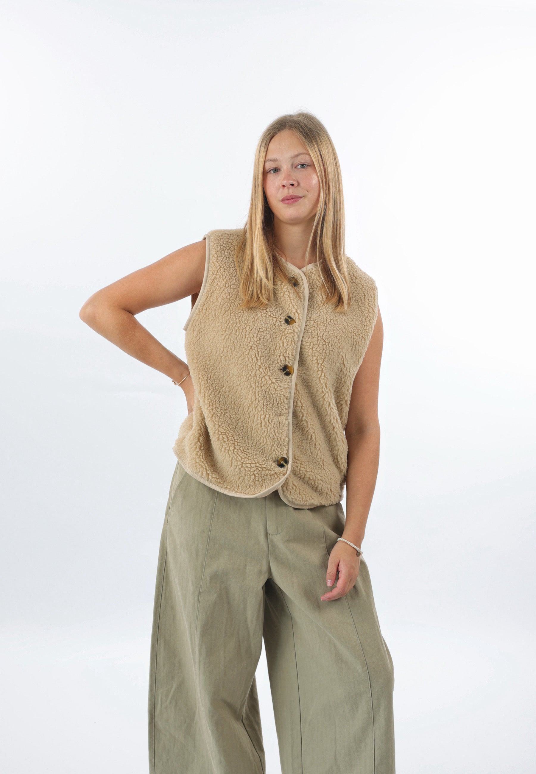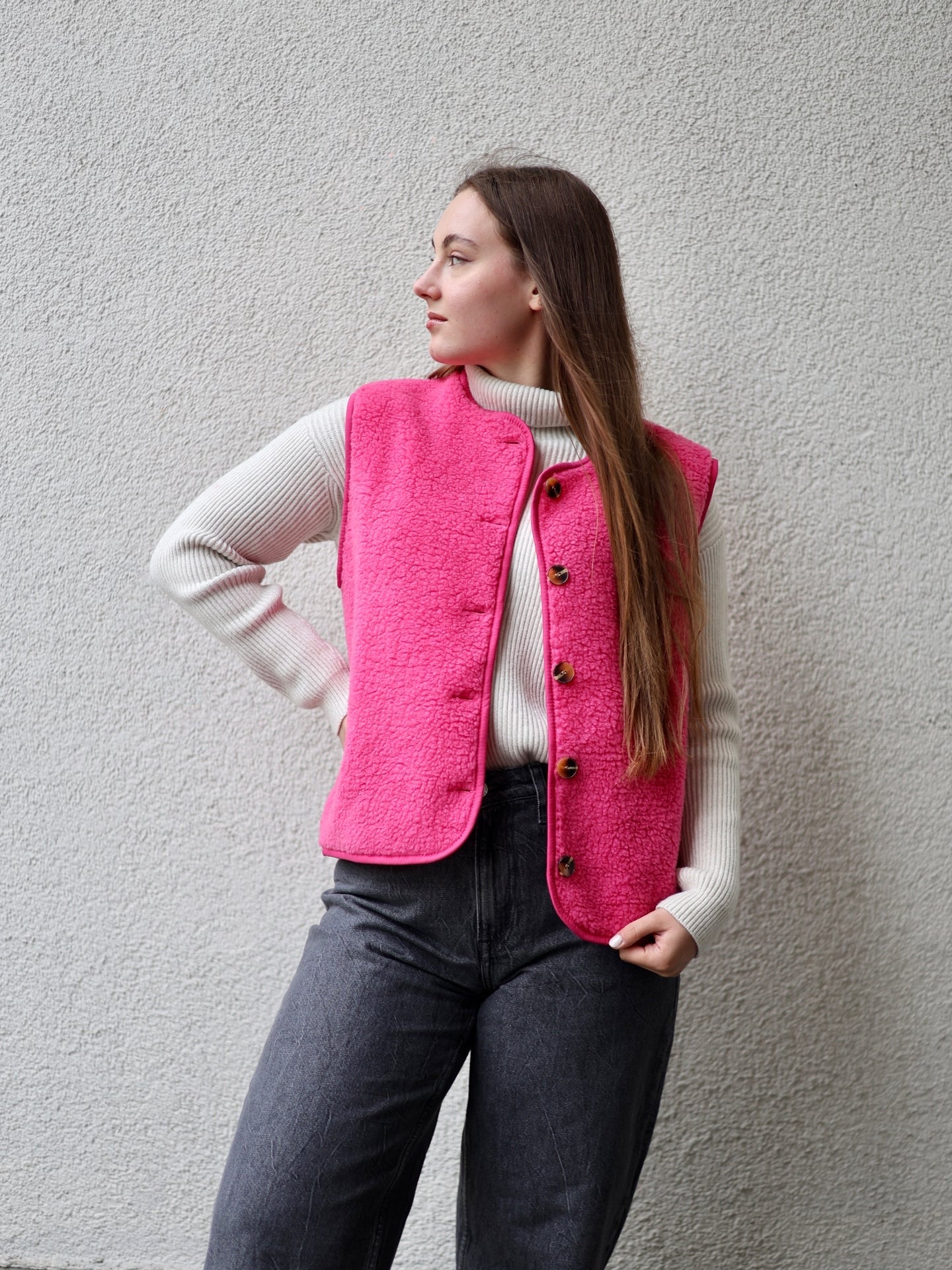 - Cordelia ist 1,67m groß und trägt die Teddyweste.