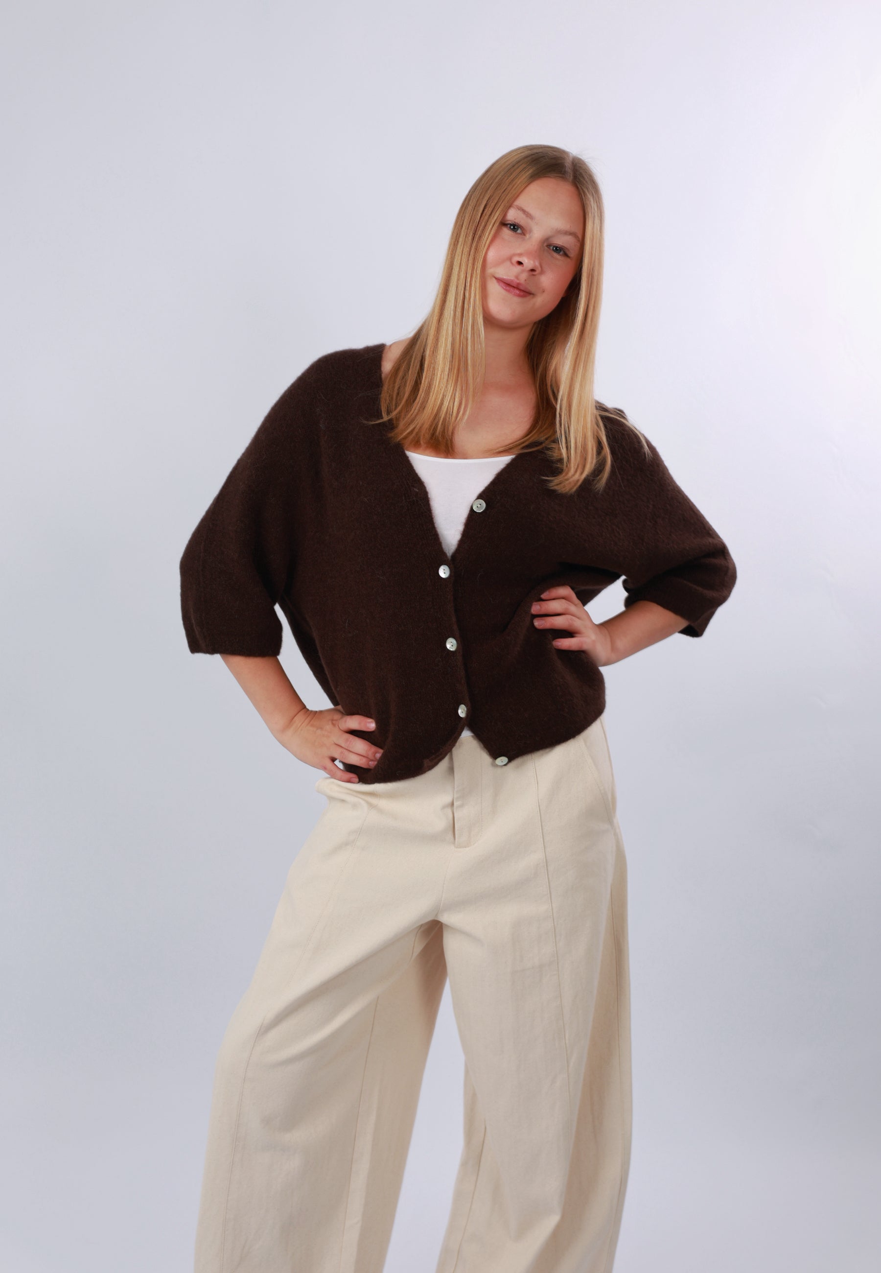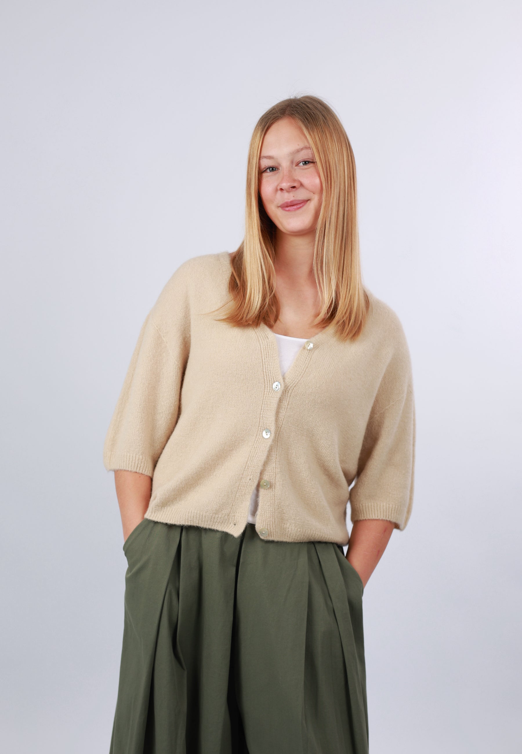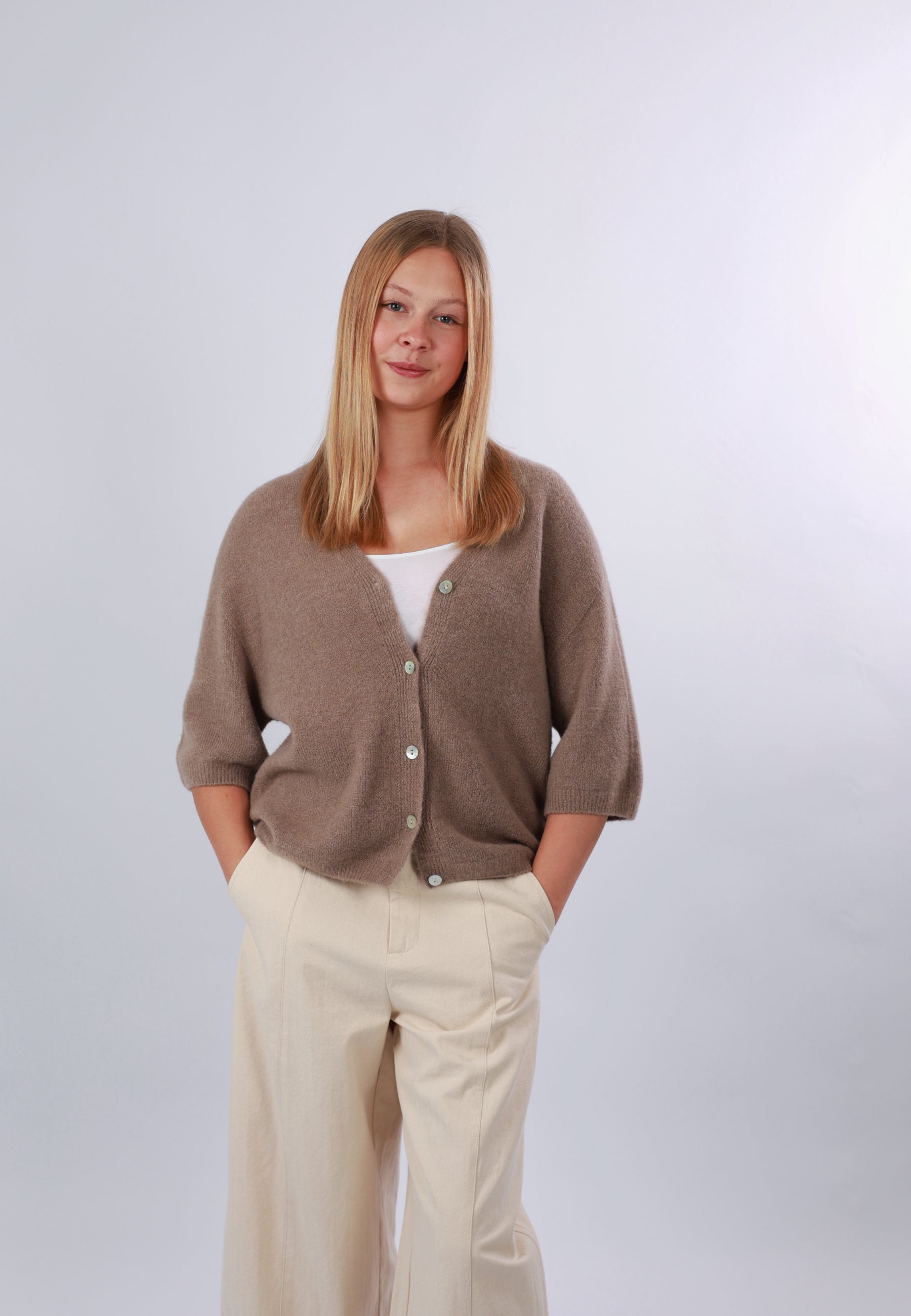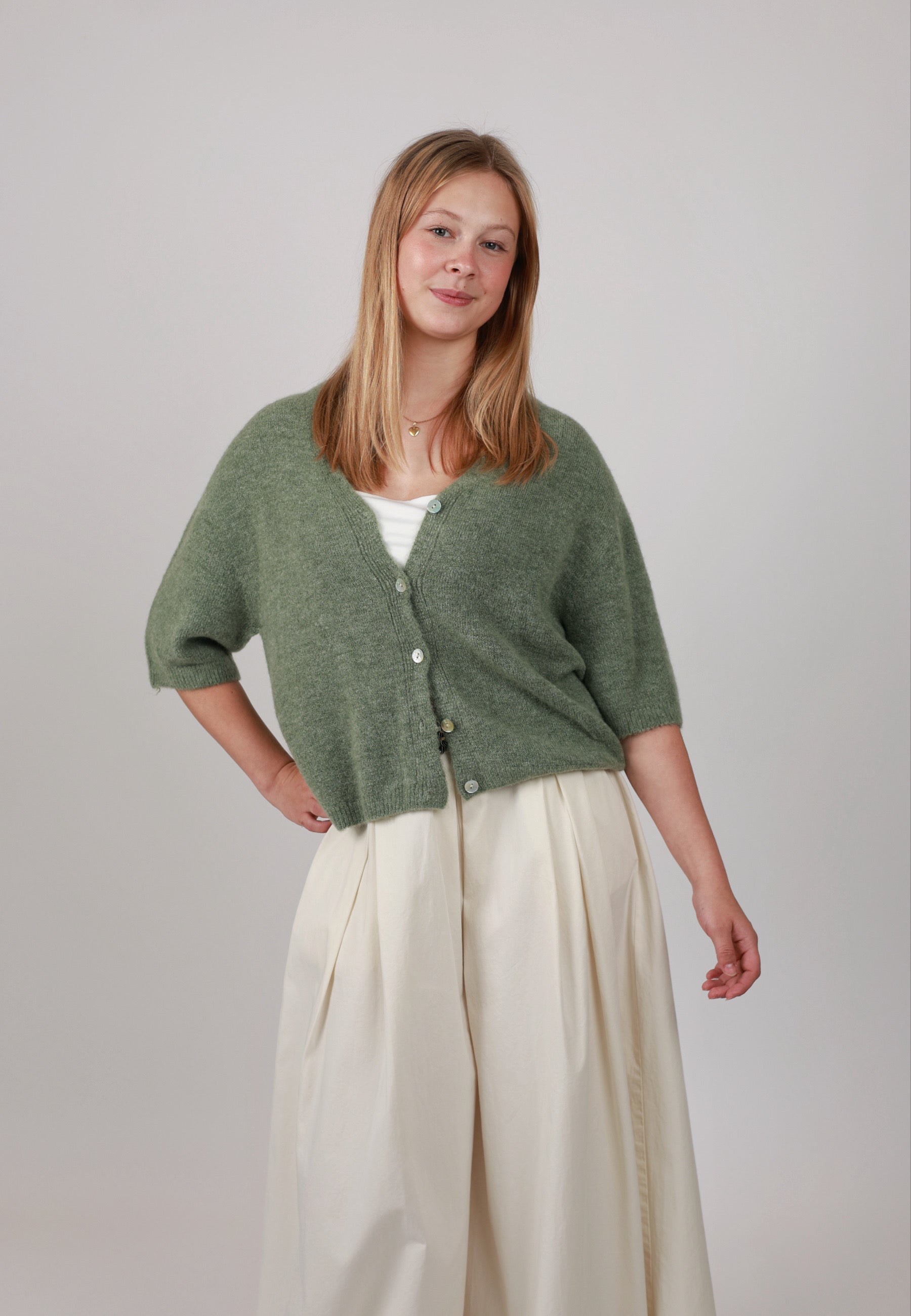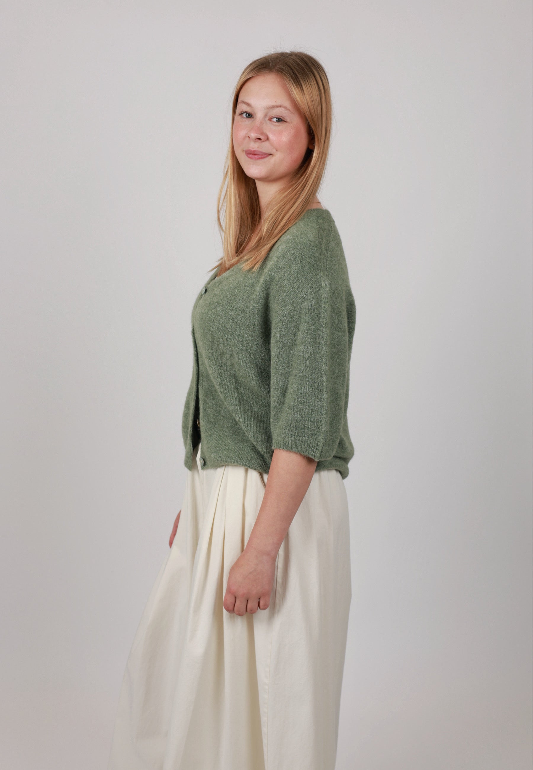 - Cordelia ist 1,67m groß und trägt die Strickjacke.