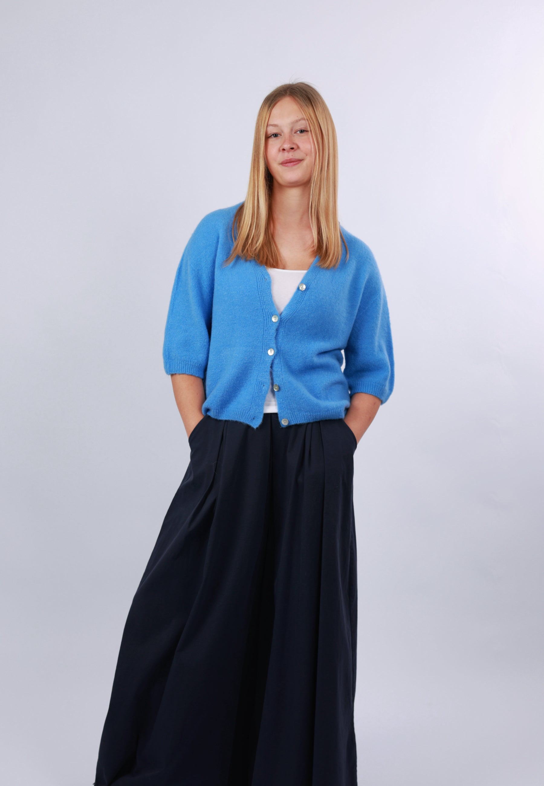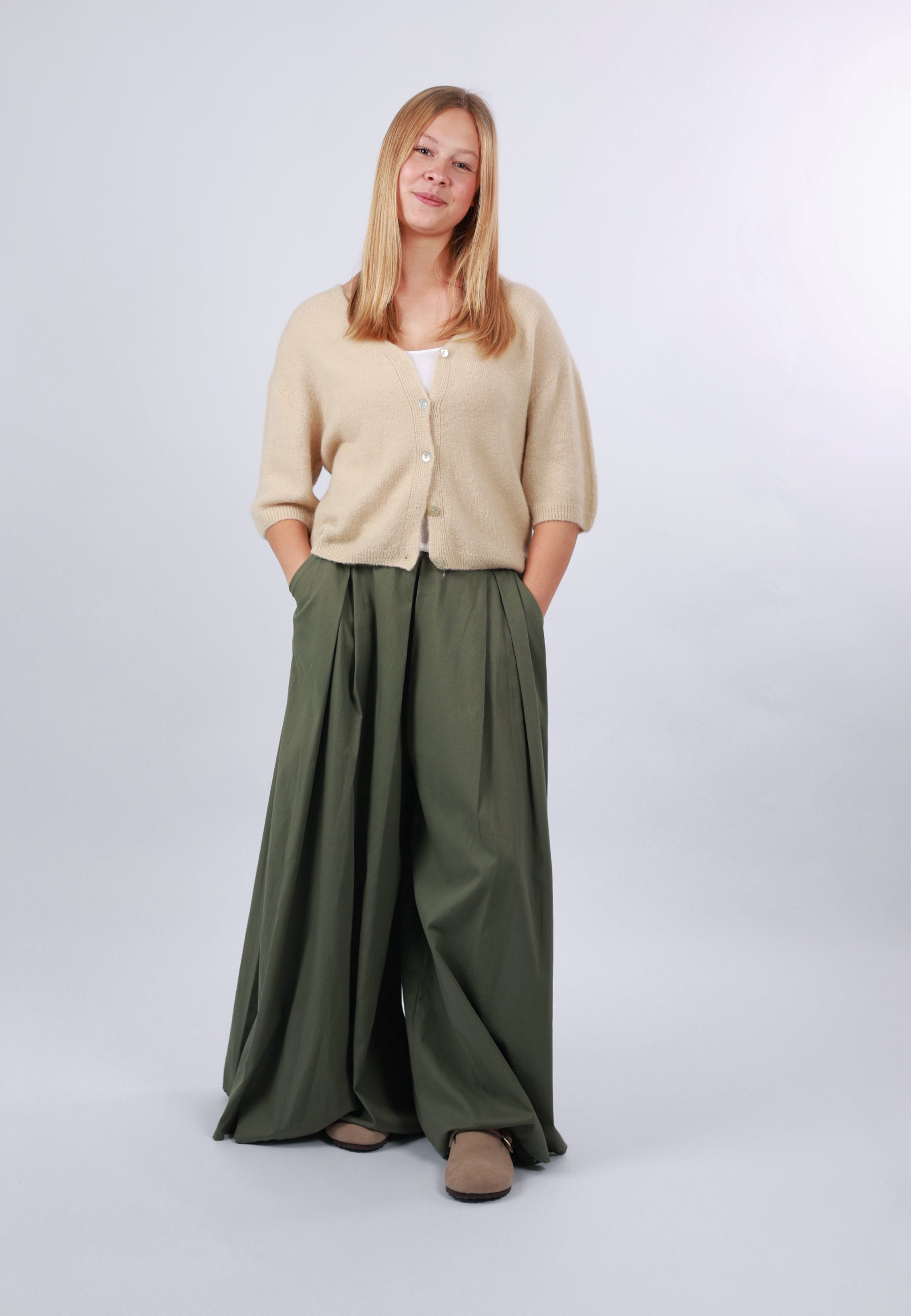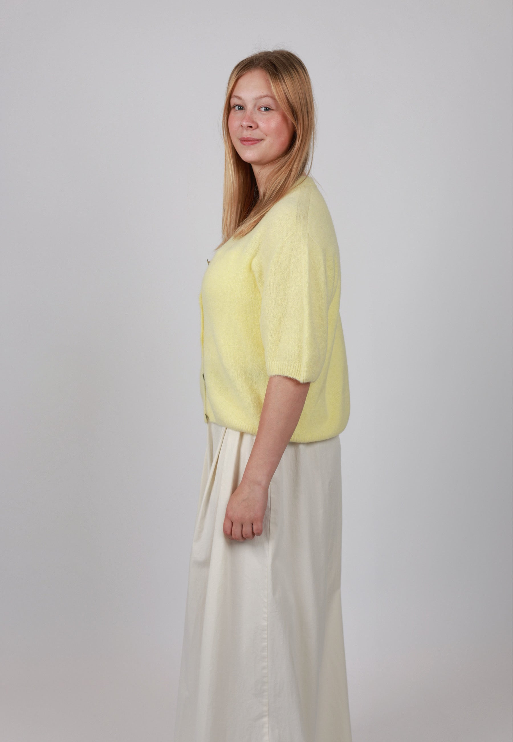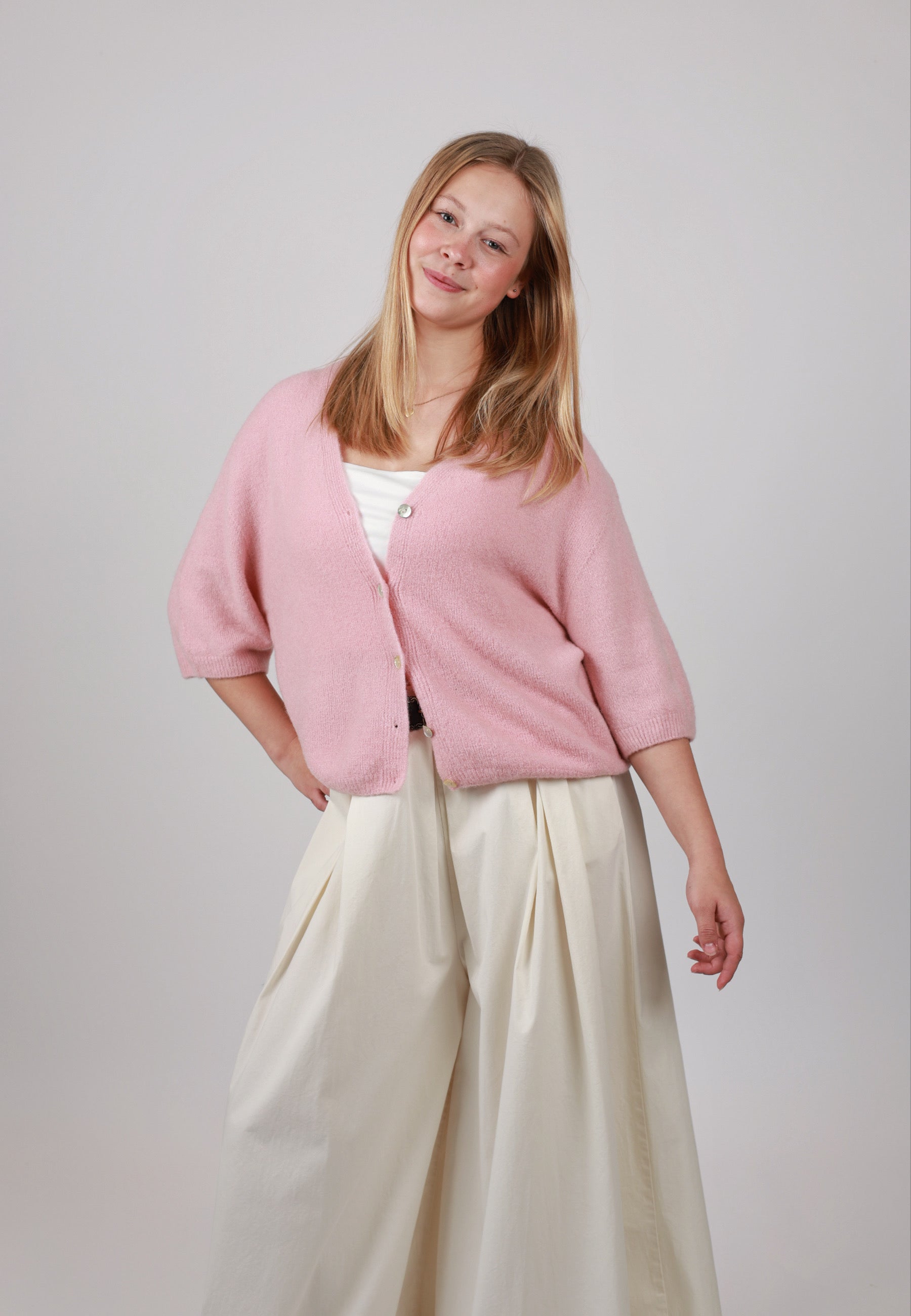 - Cordelia ist 1,67m groß und trägt die Strickjacke.