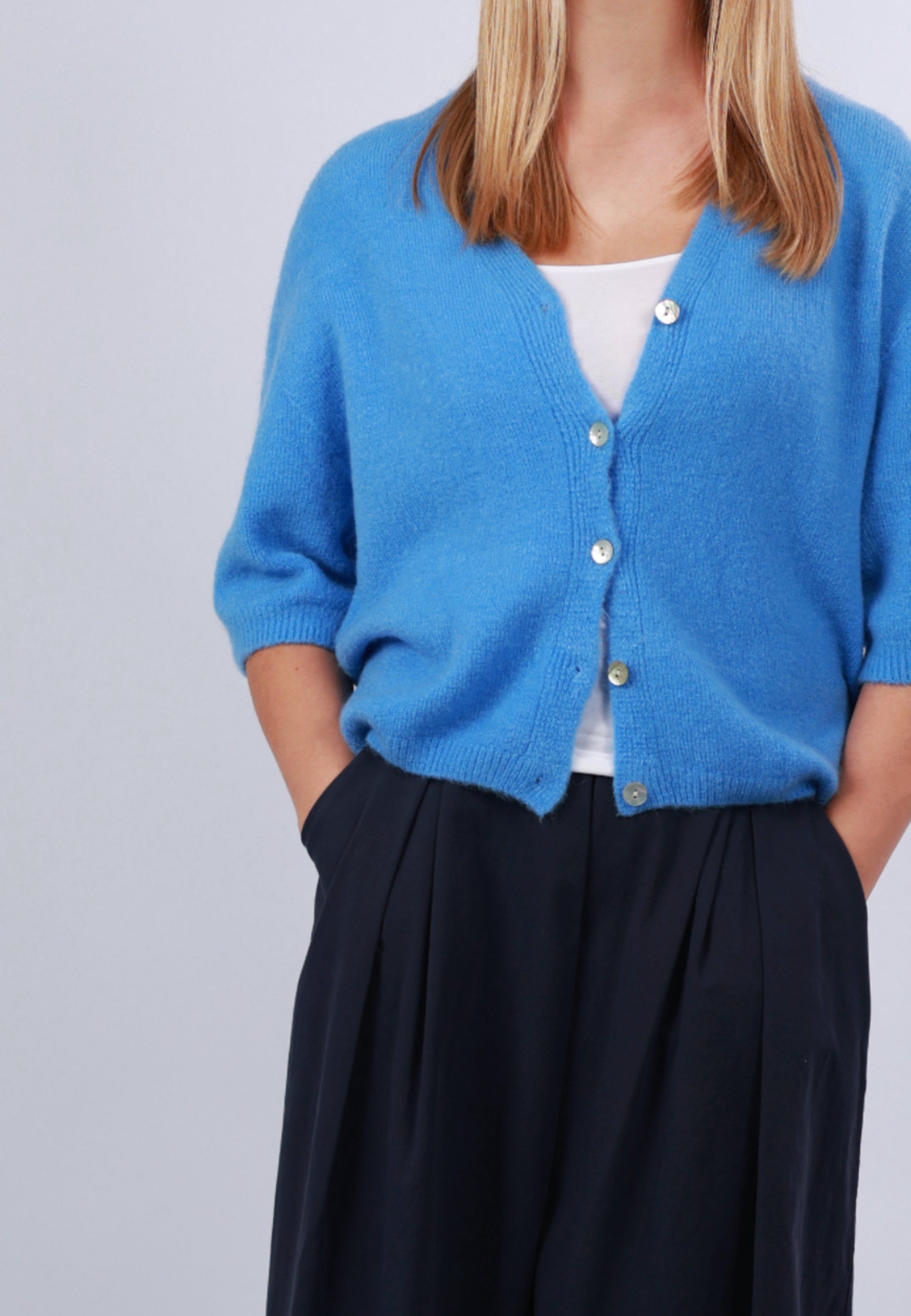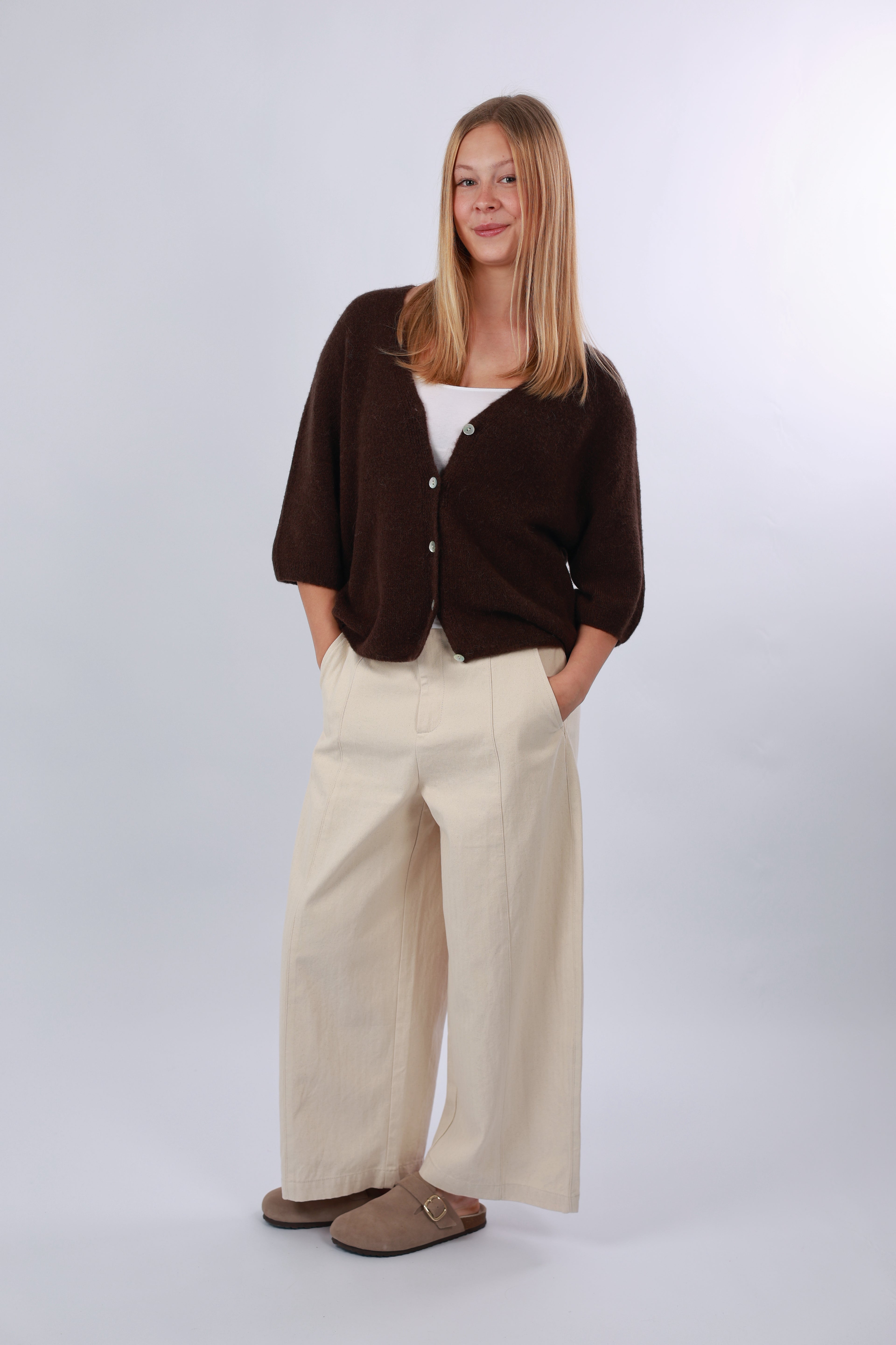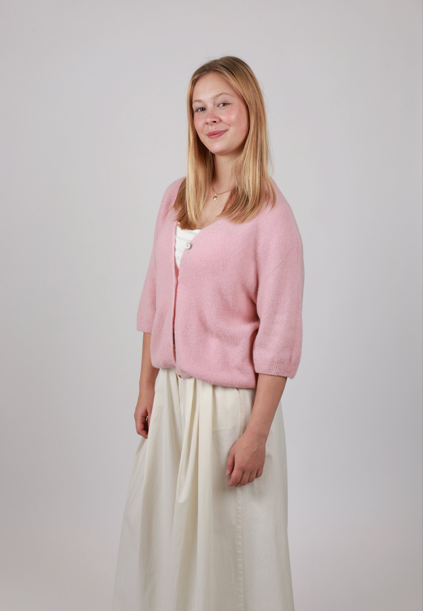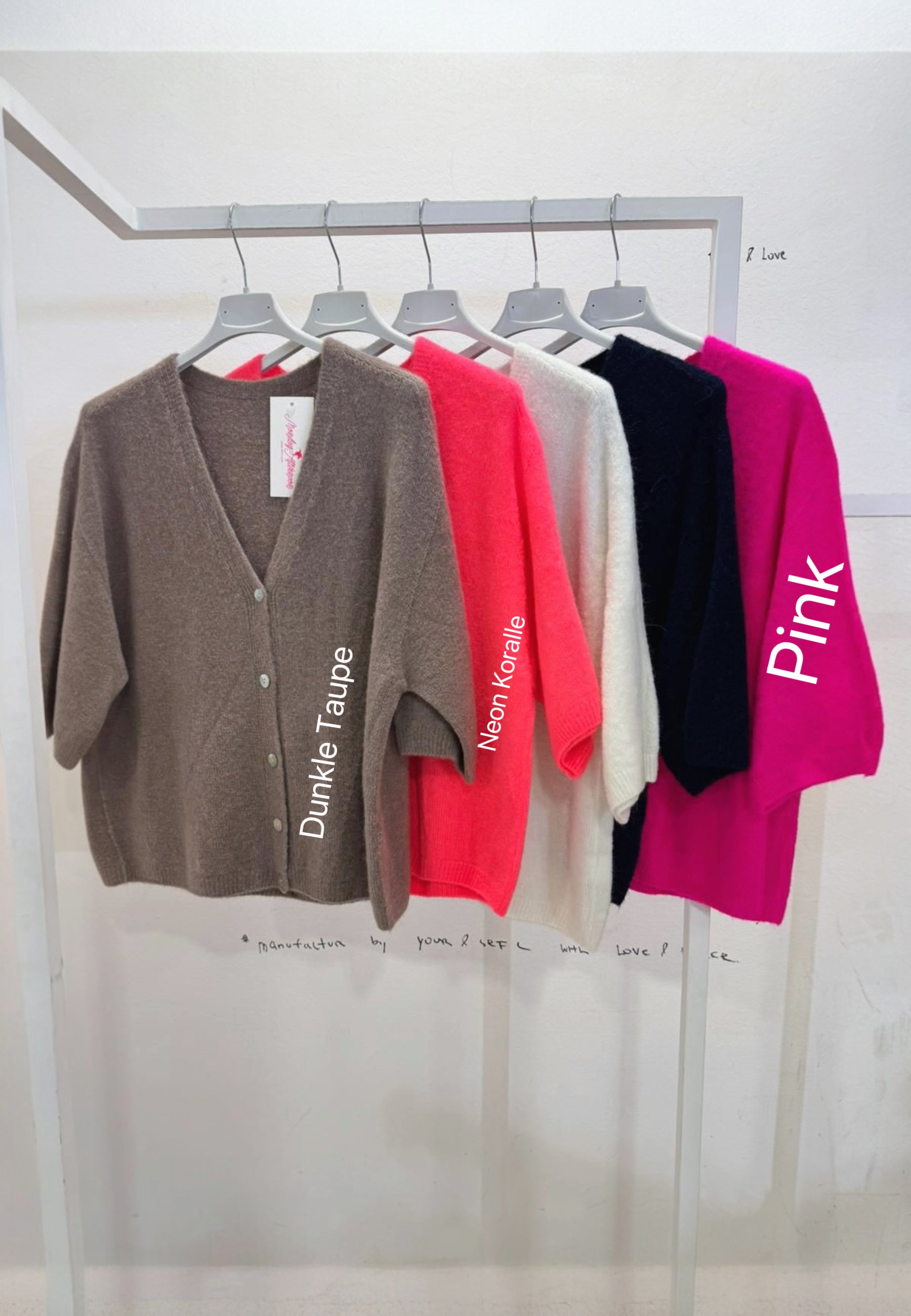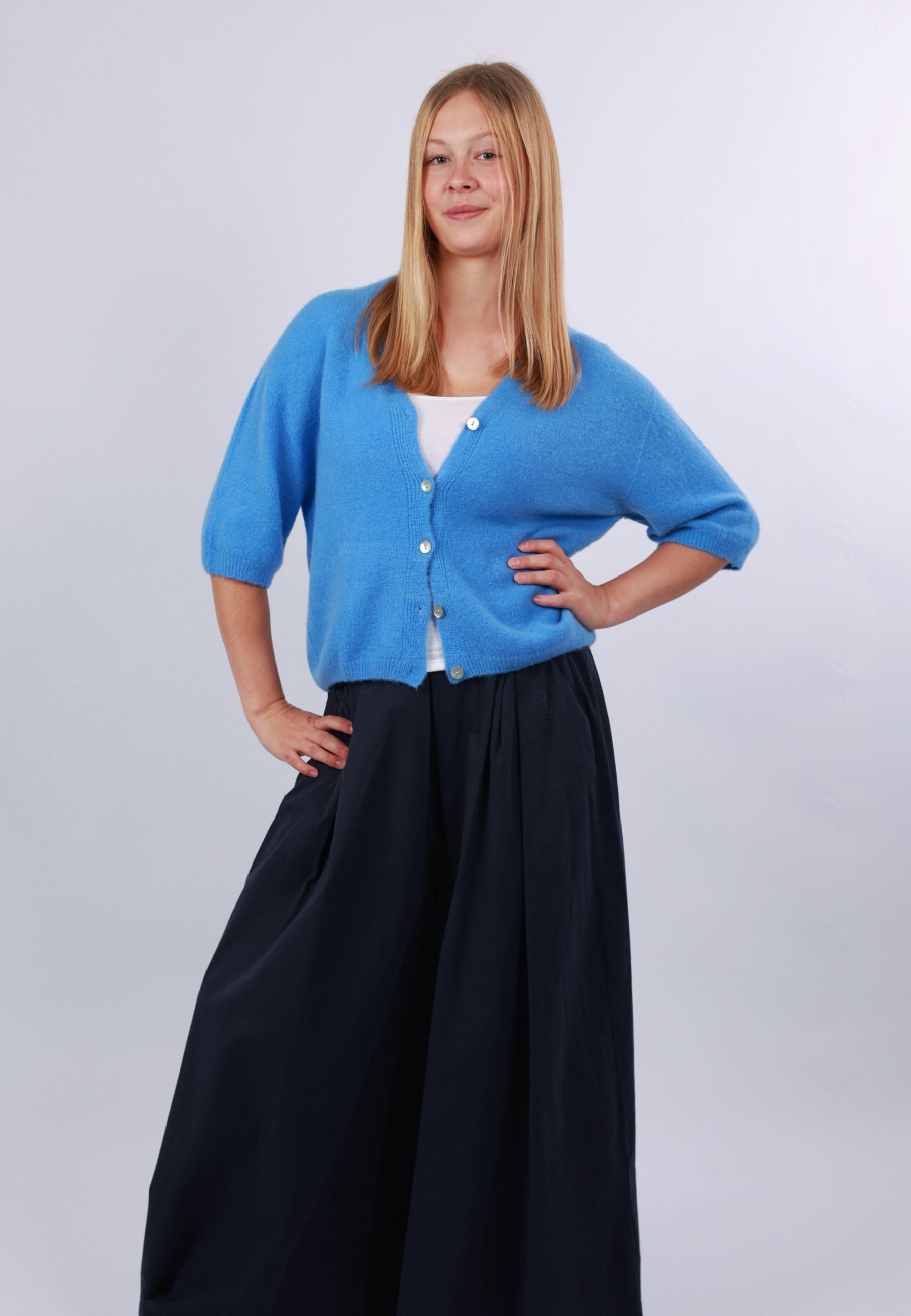 - Cordelia ist 1,67m groß und trägt die Strickjacke.