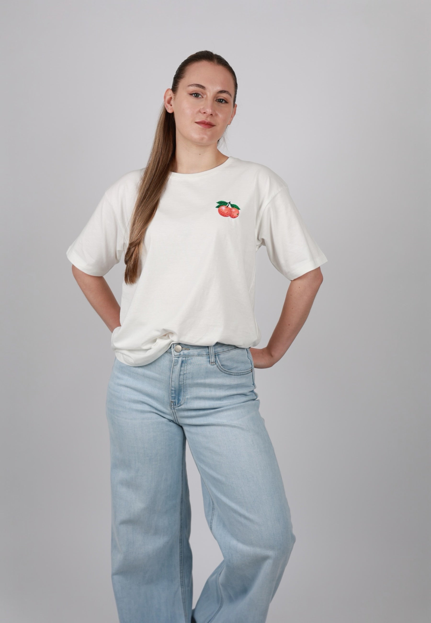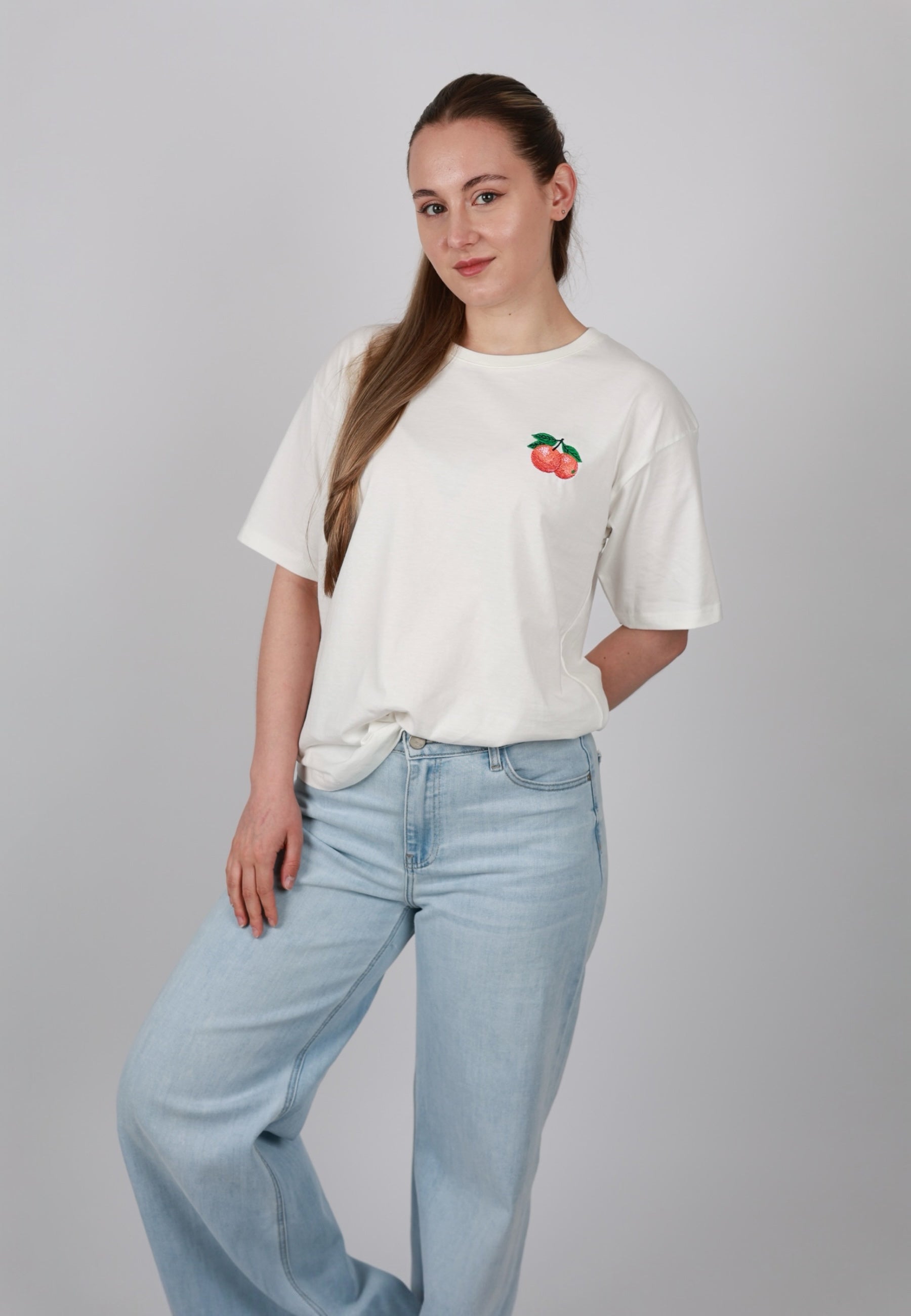 - Anastasia ist 1,70m groß und trägt das T-Shirt.