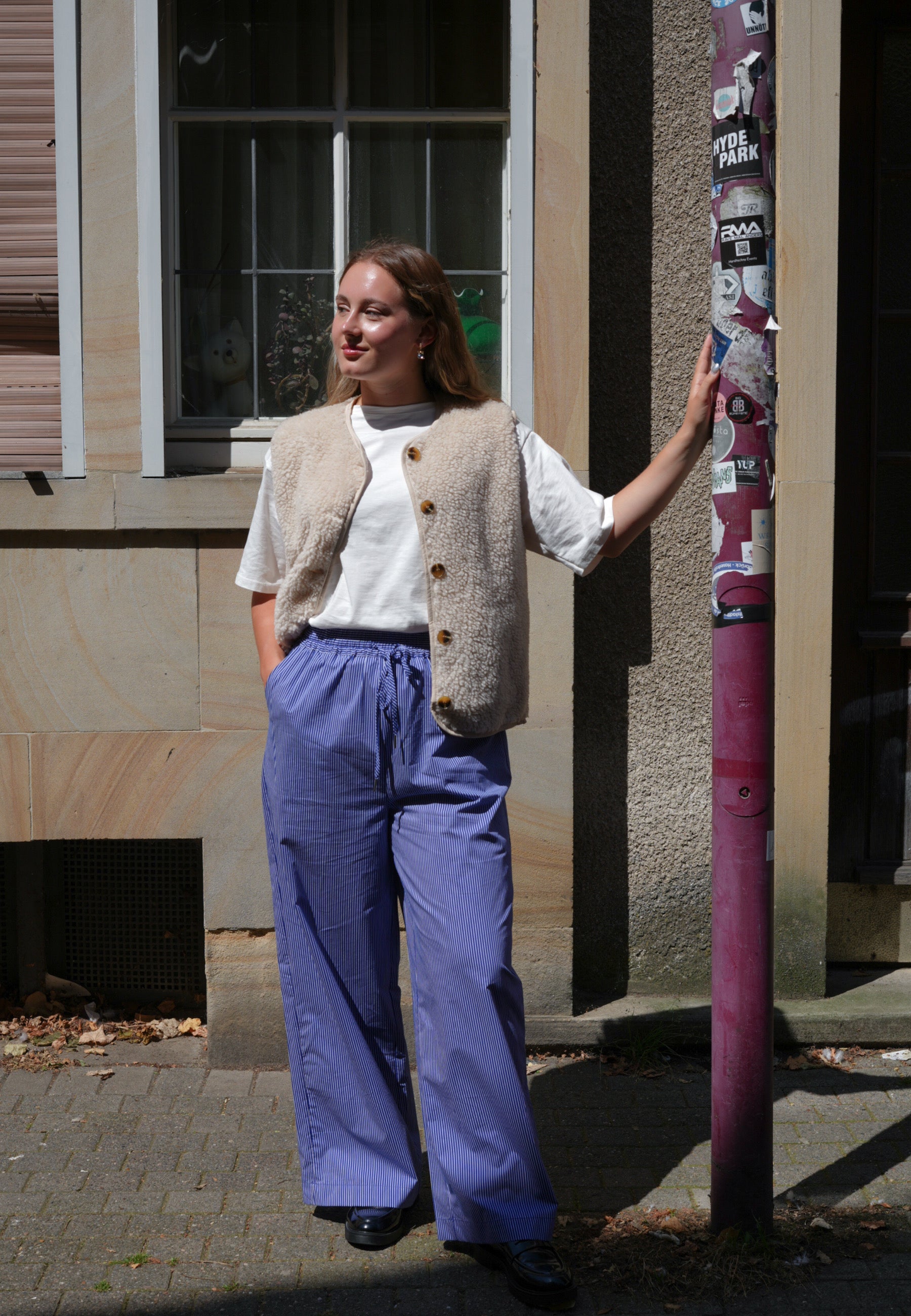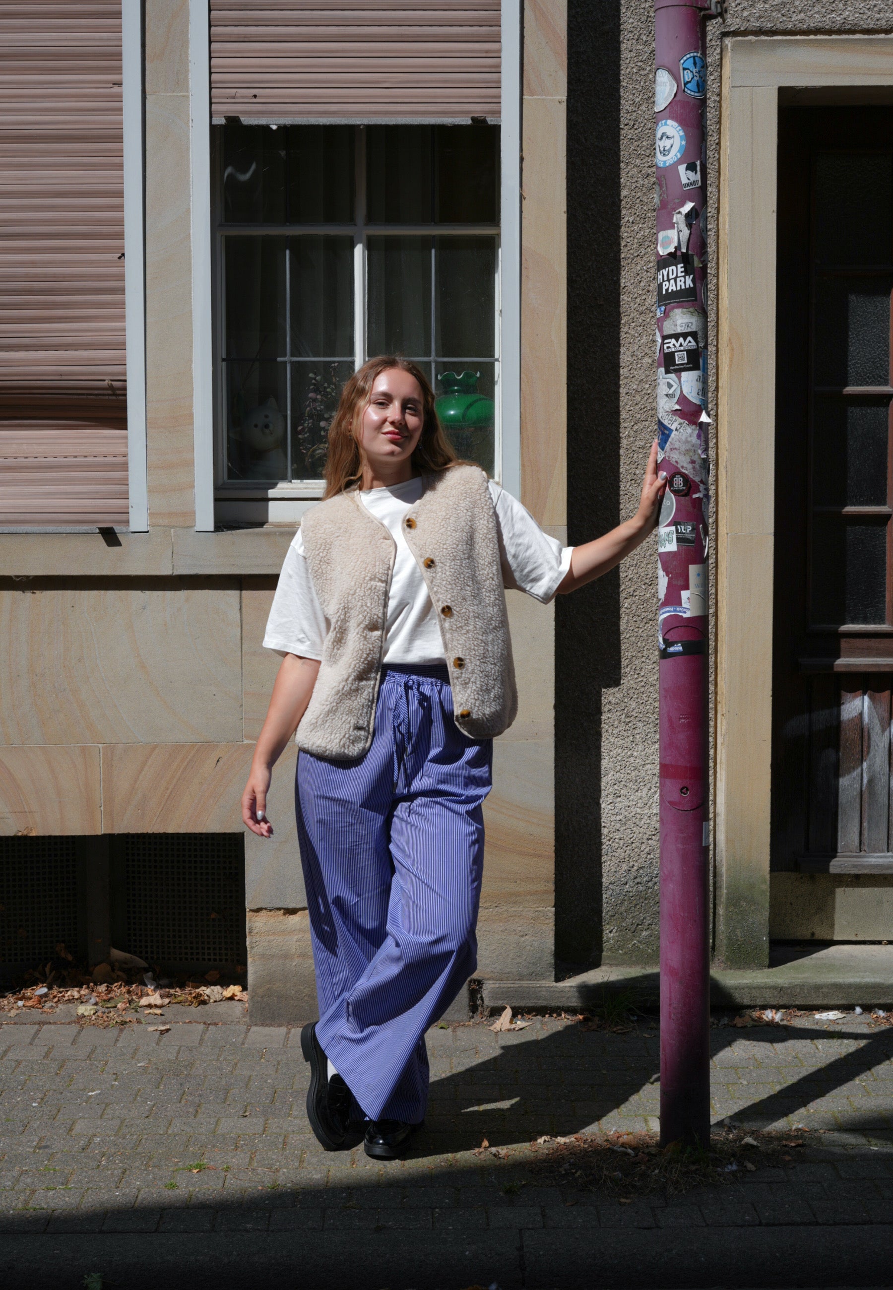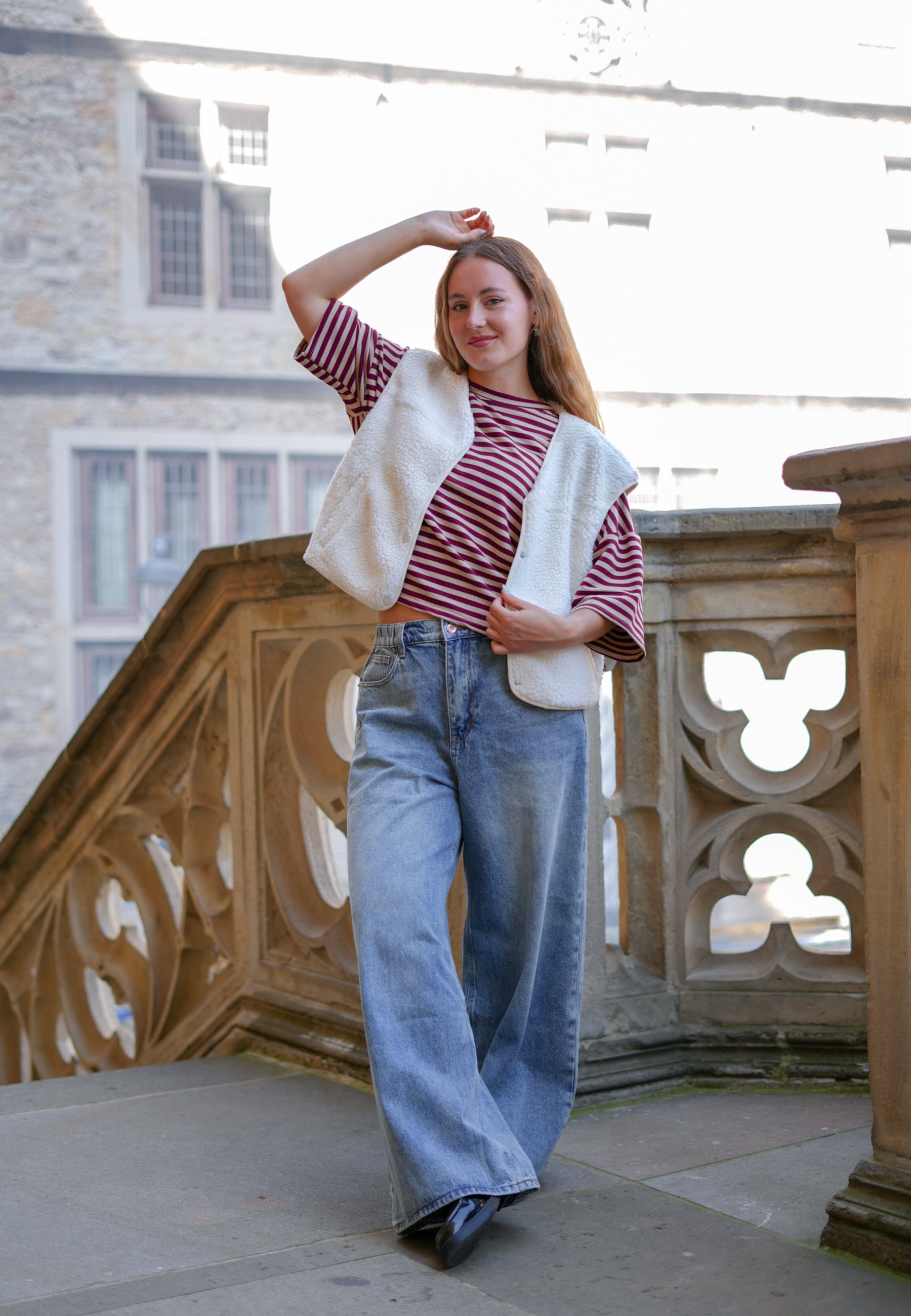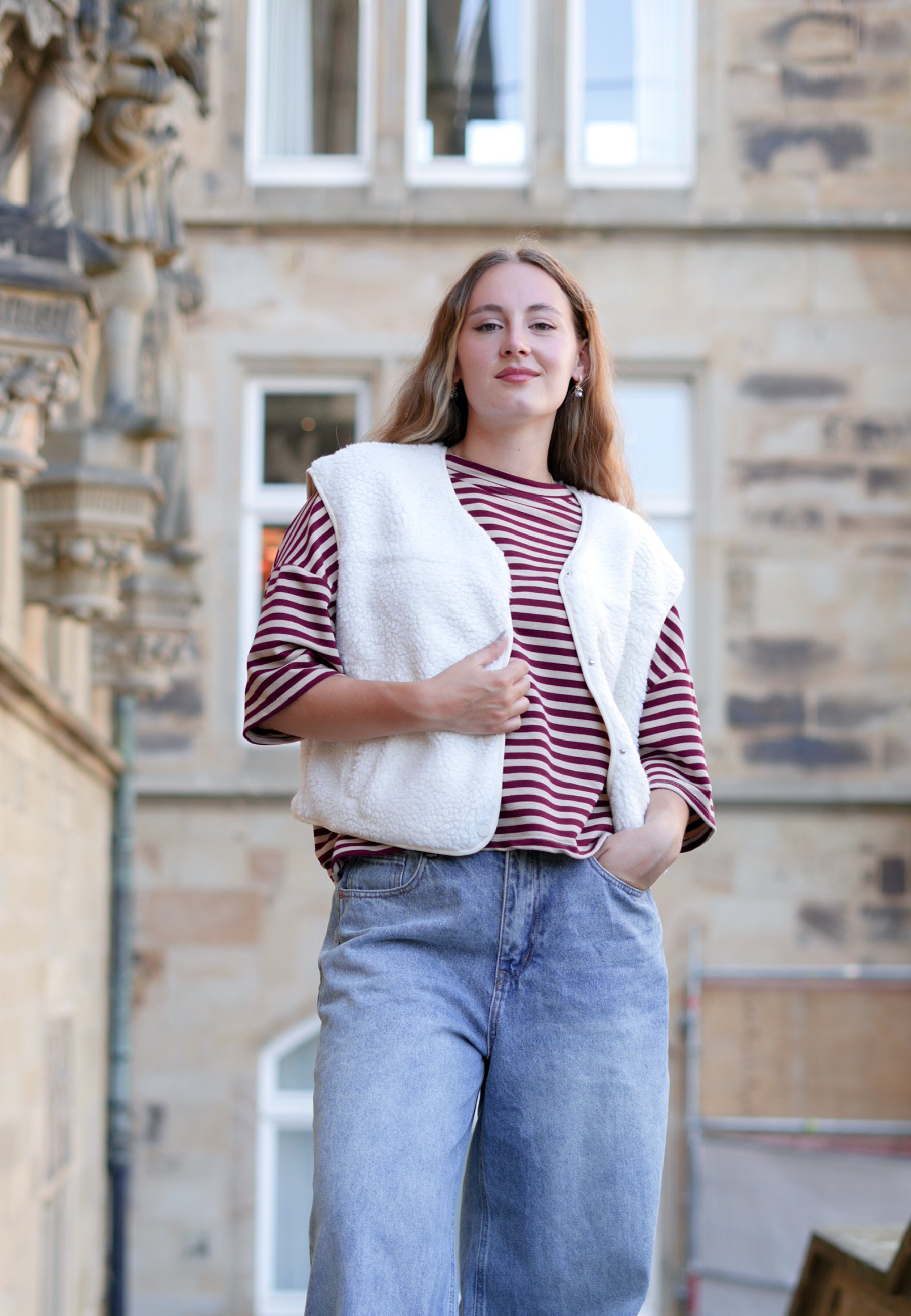 Die Weste ist Oversize – schön locker, lässig. Perfekt für einen entspannten, cozy Look.