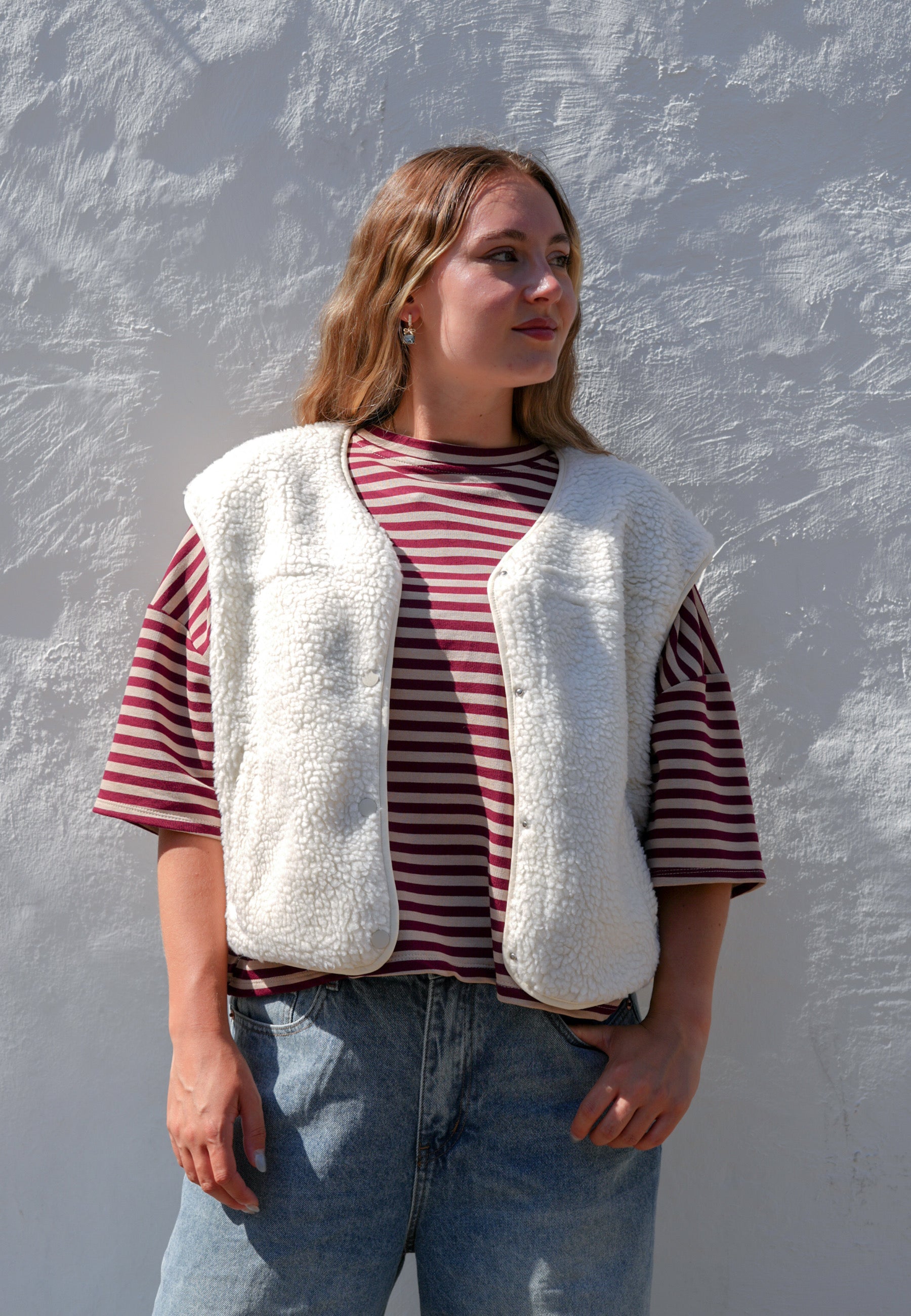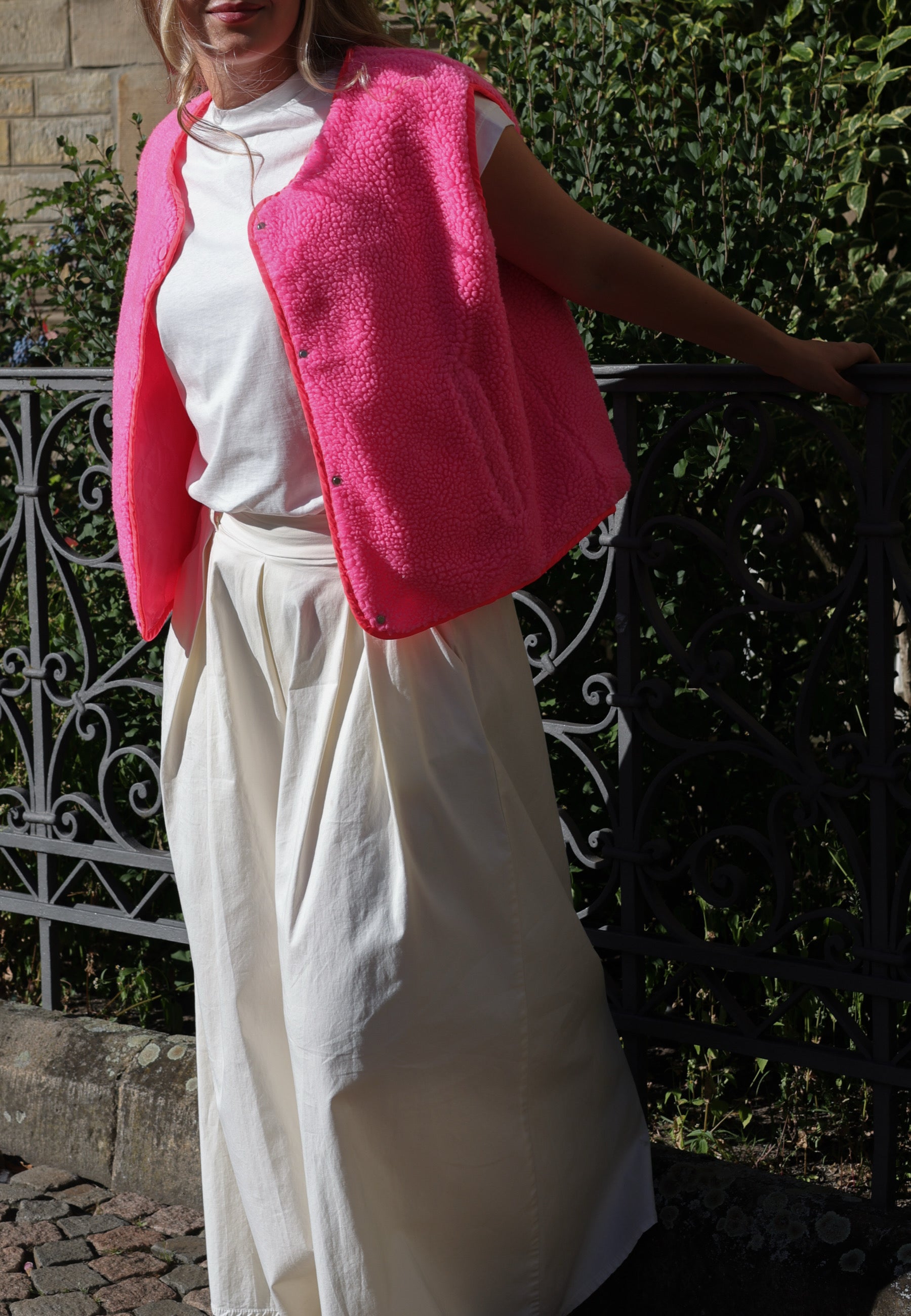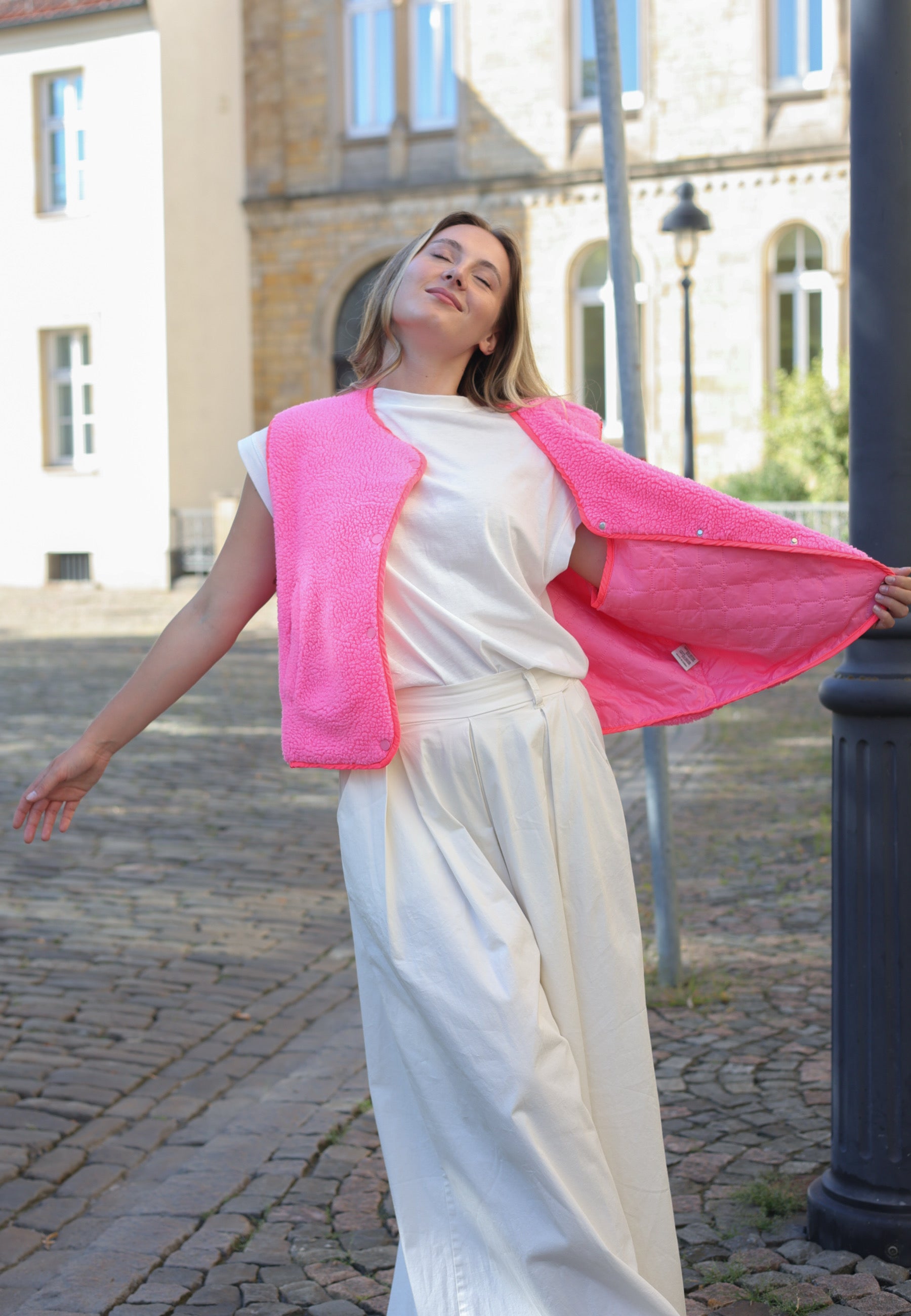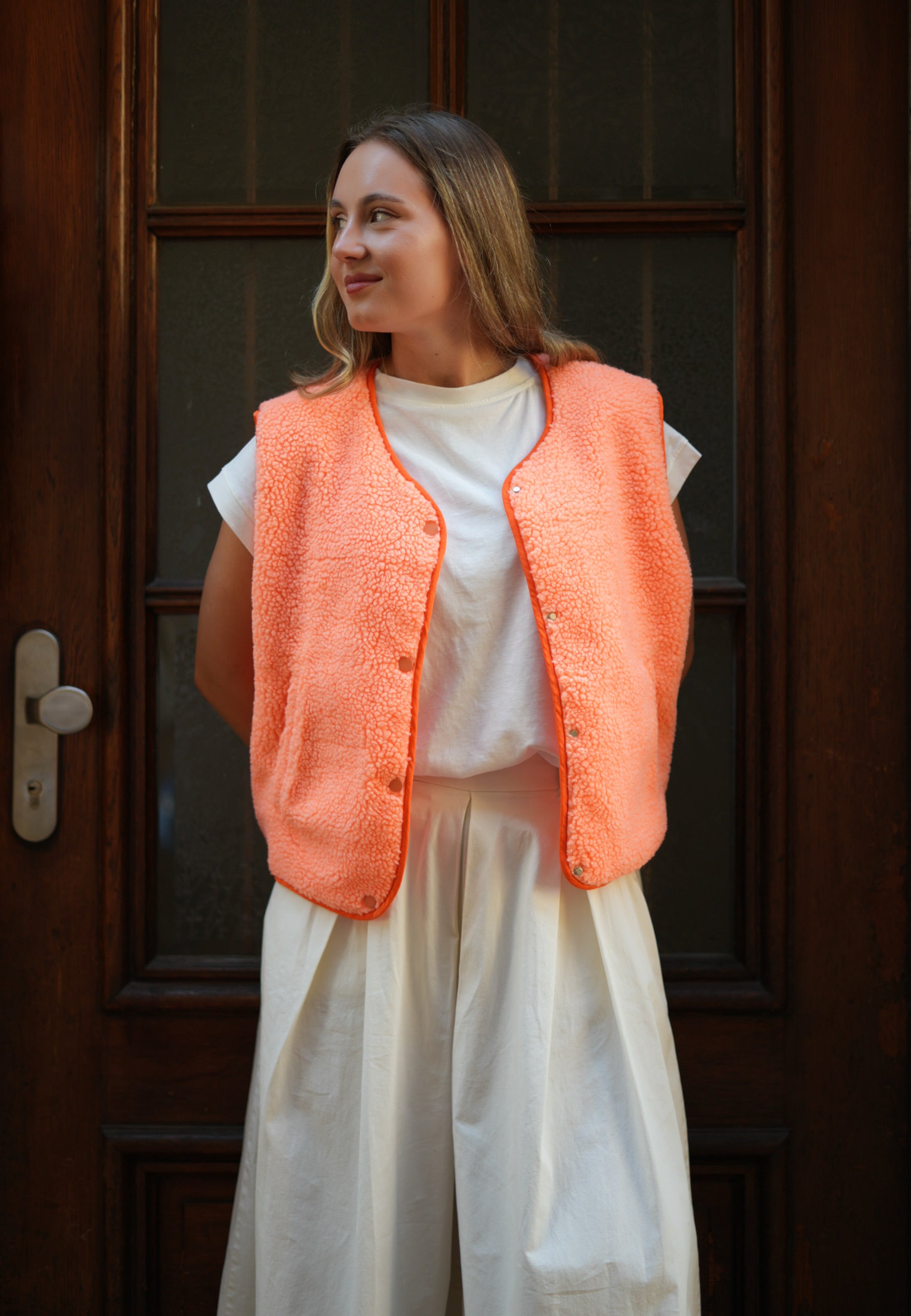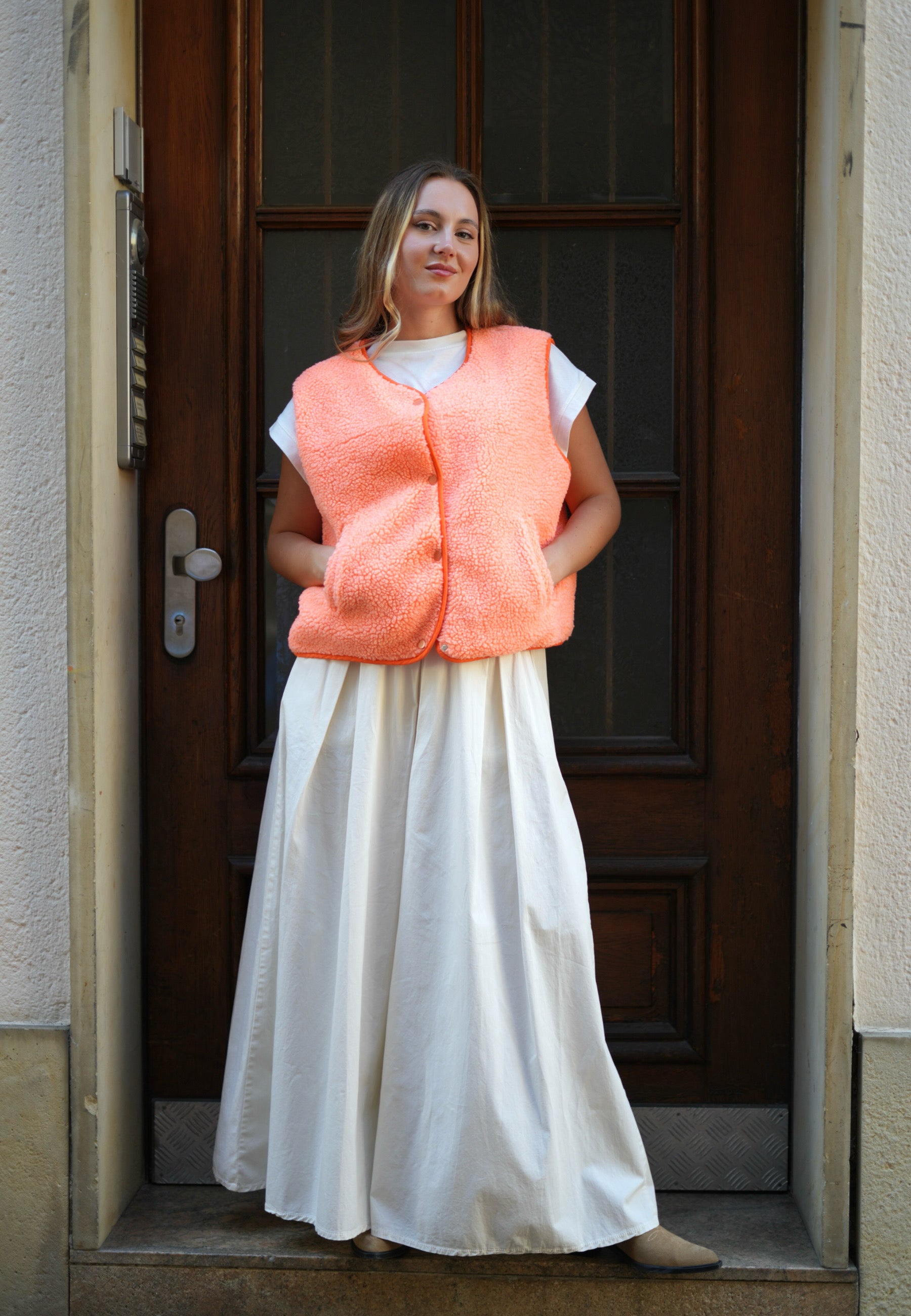 Die Weste ist Oversize – schön locker, lässig. Perfekt für einen entspannten, cozy Look.