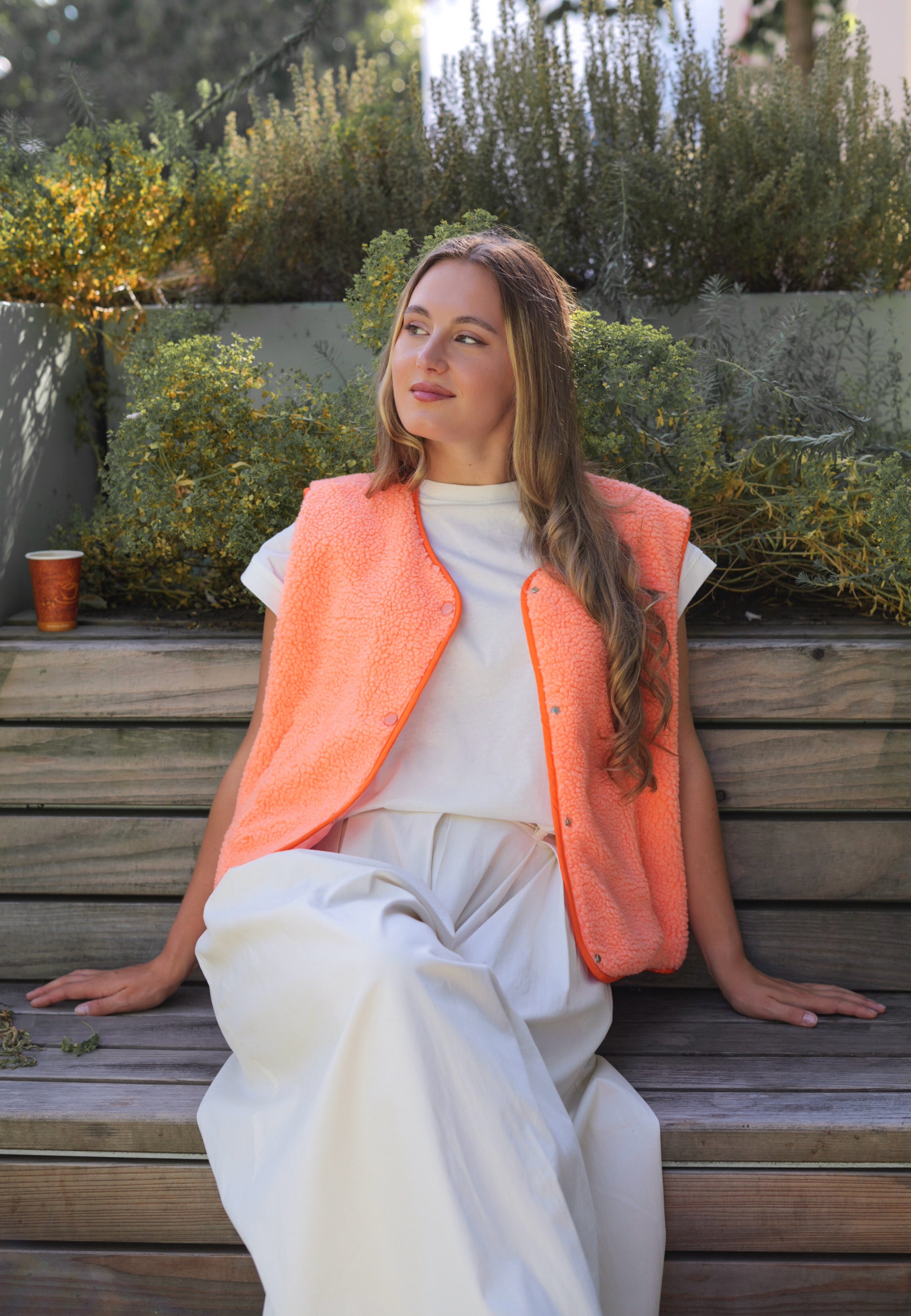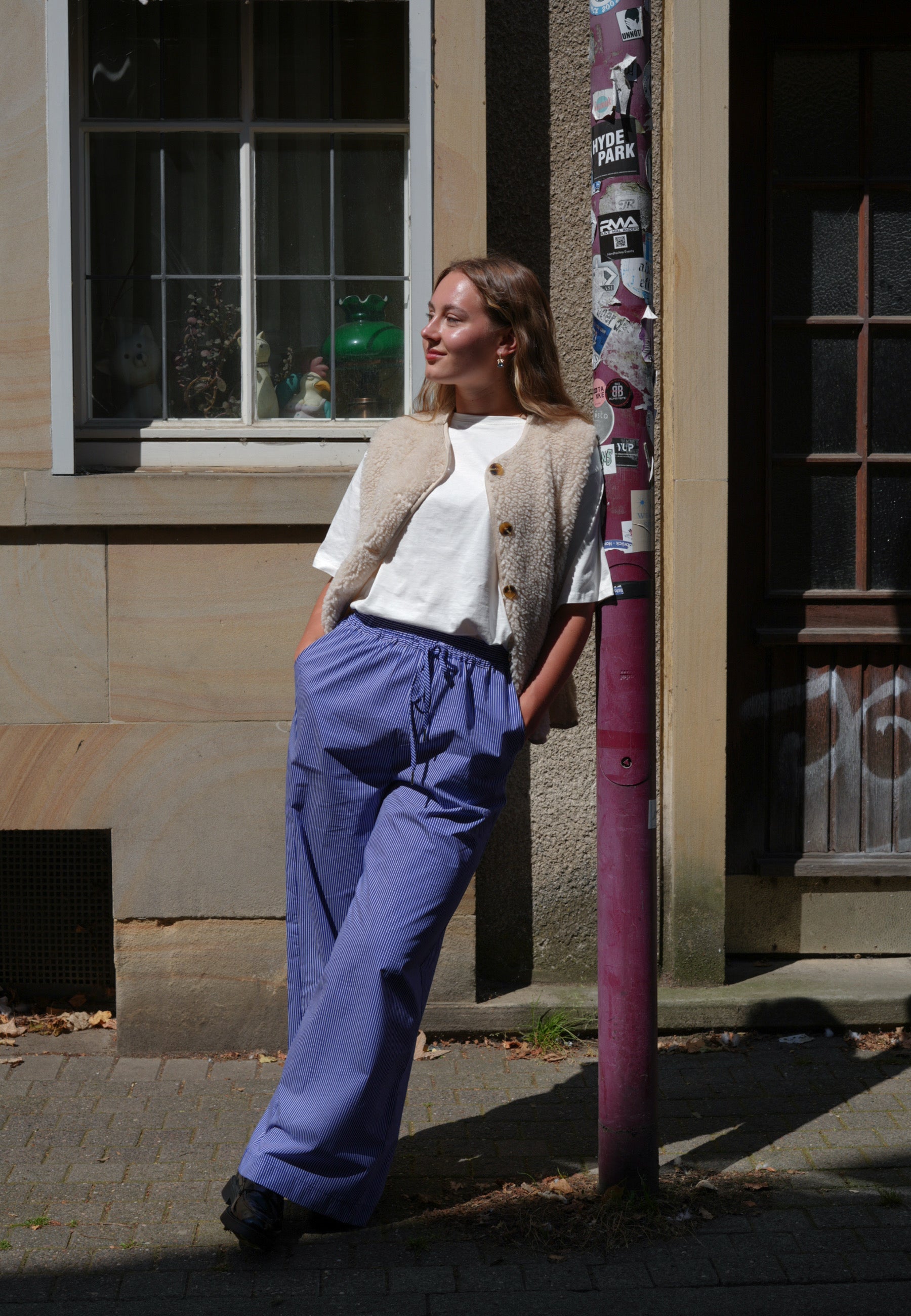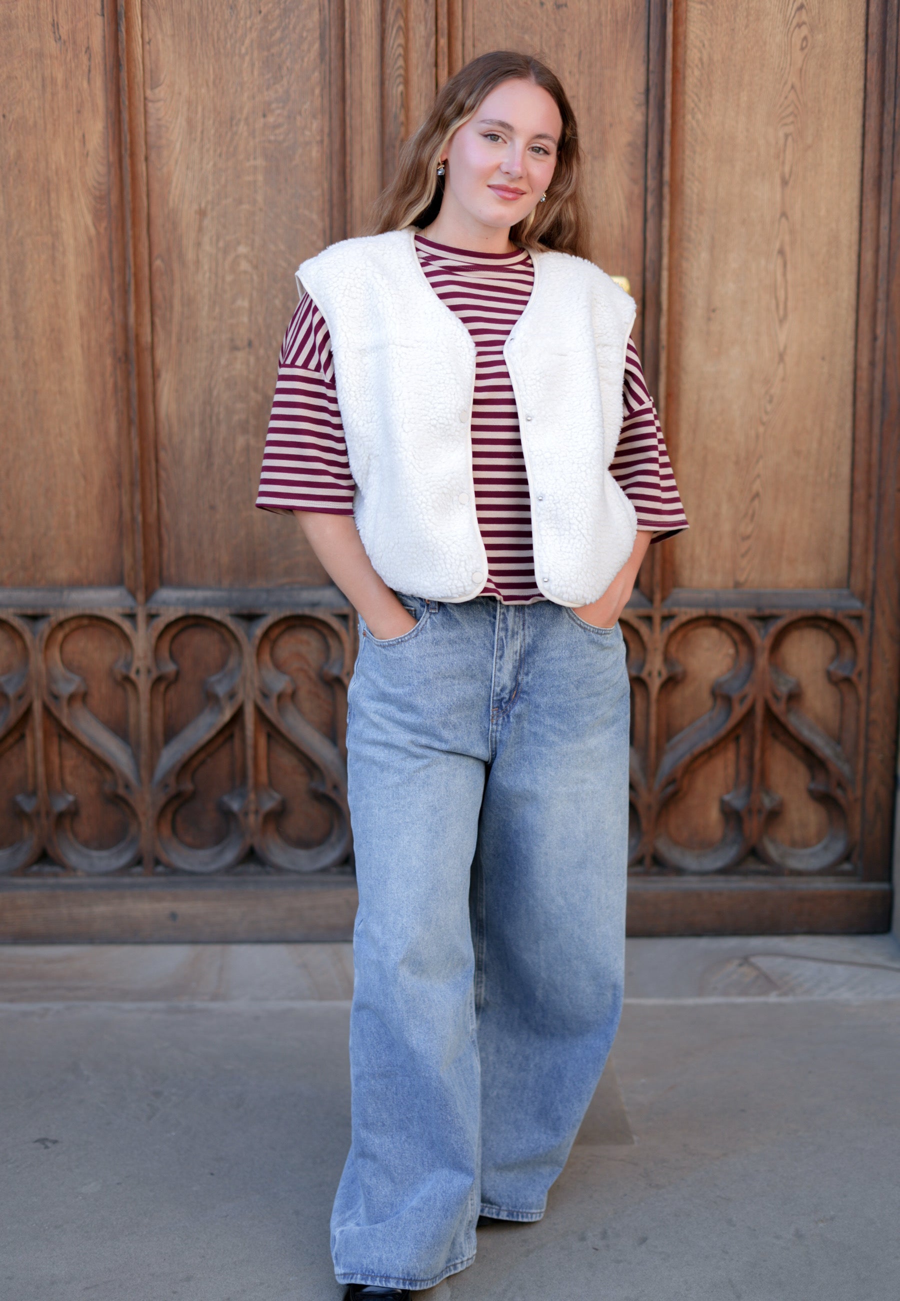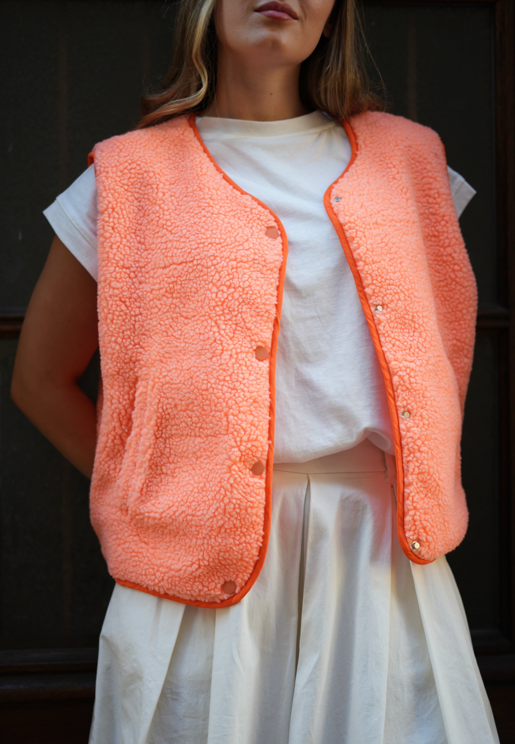 Die Weste ist Oversize – schön locker, lässig. Perfekt für einen entspannten, cozy Look.